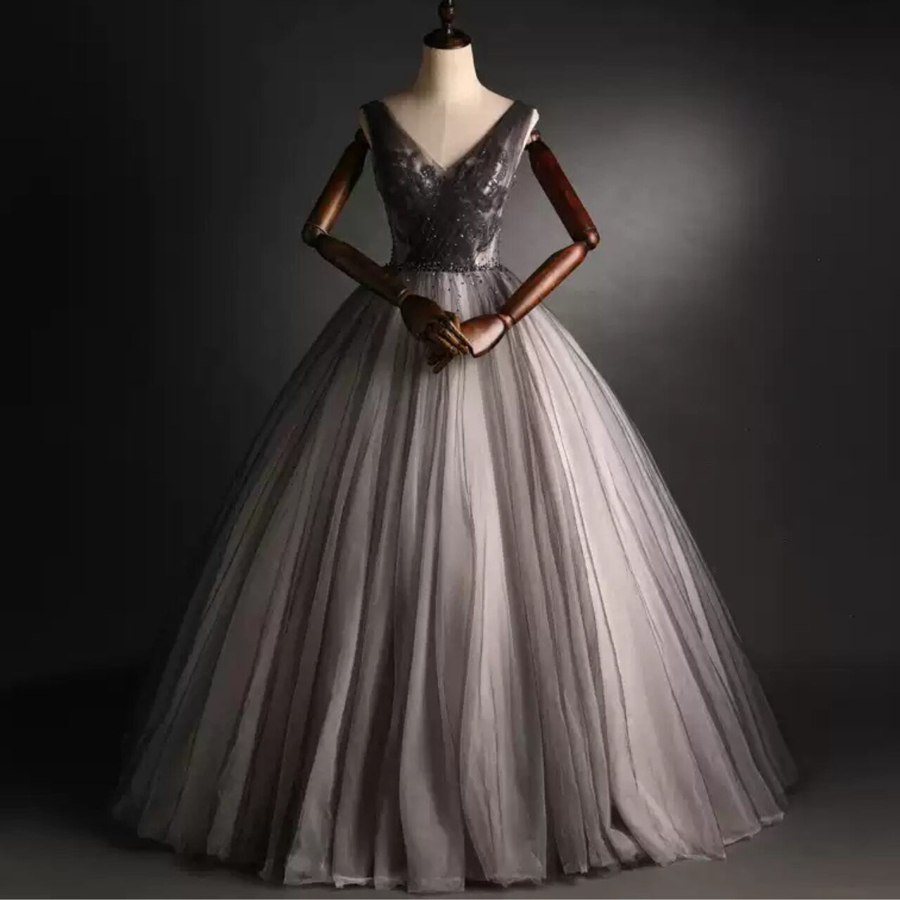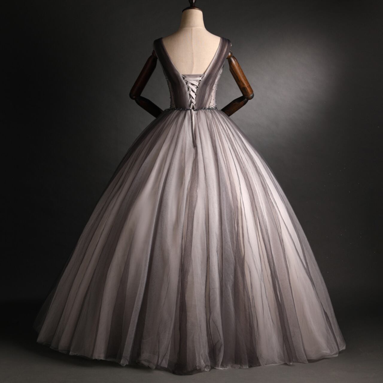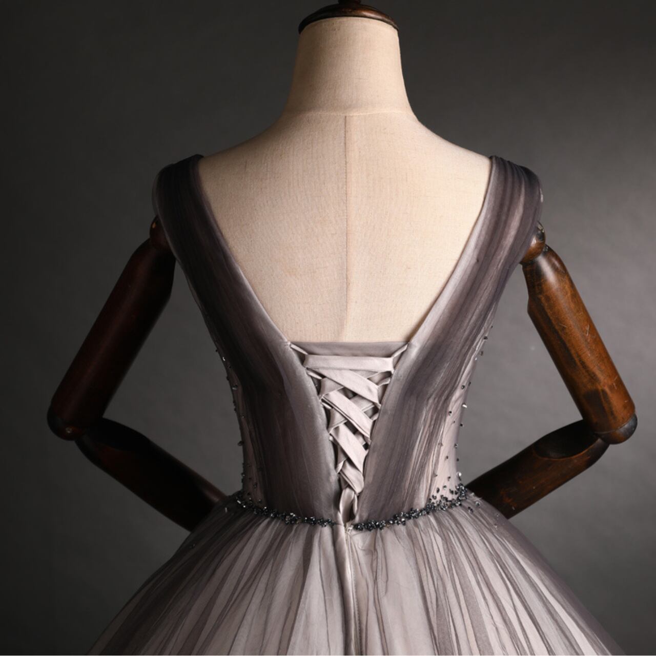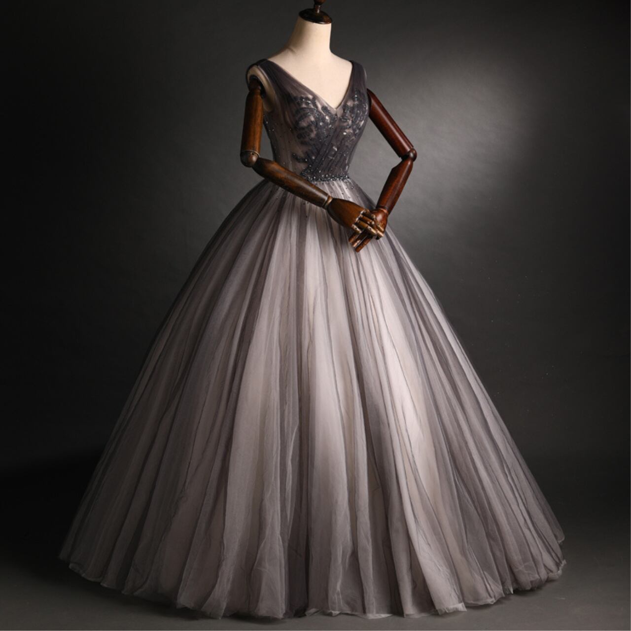 チュール素材AラインVネックドレス CL0212
