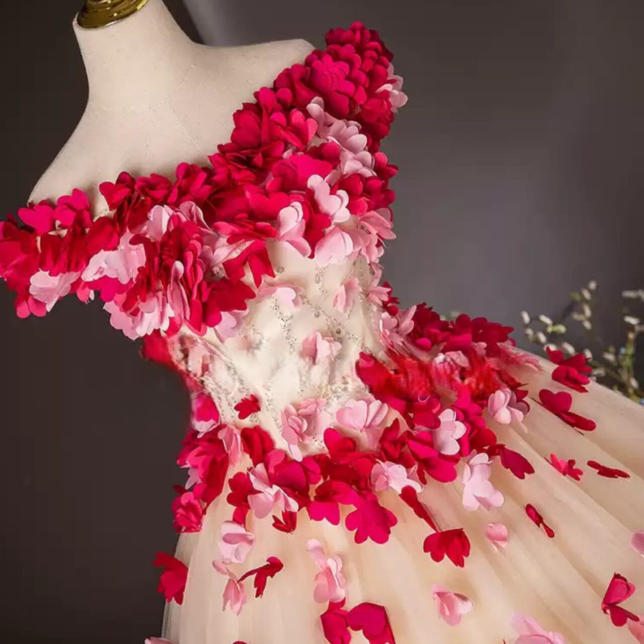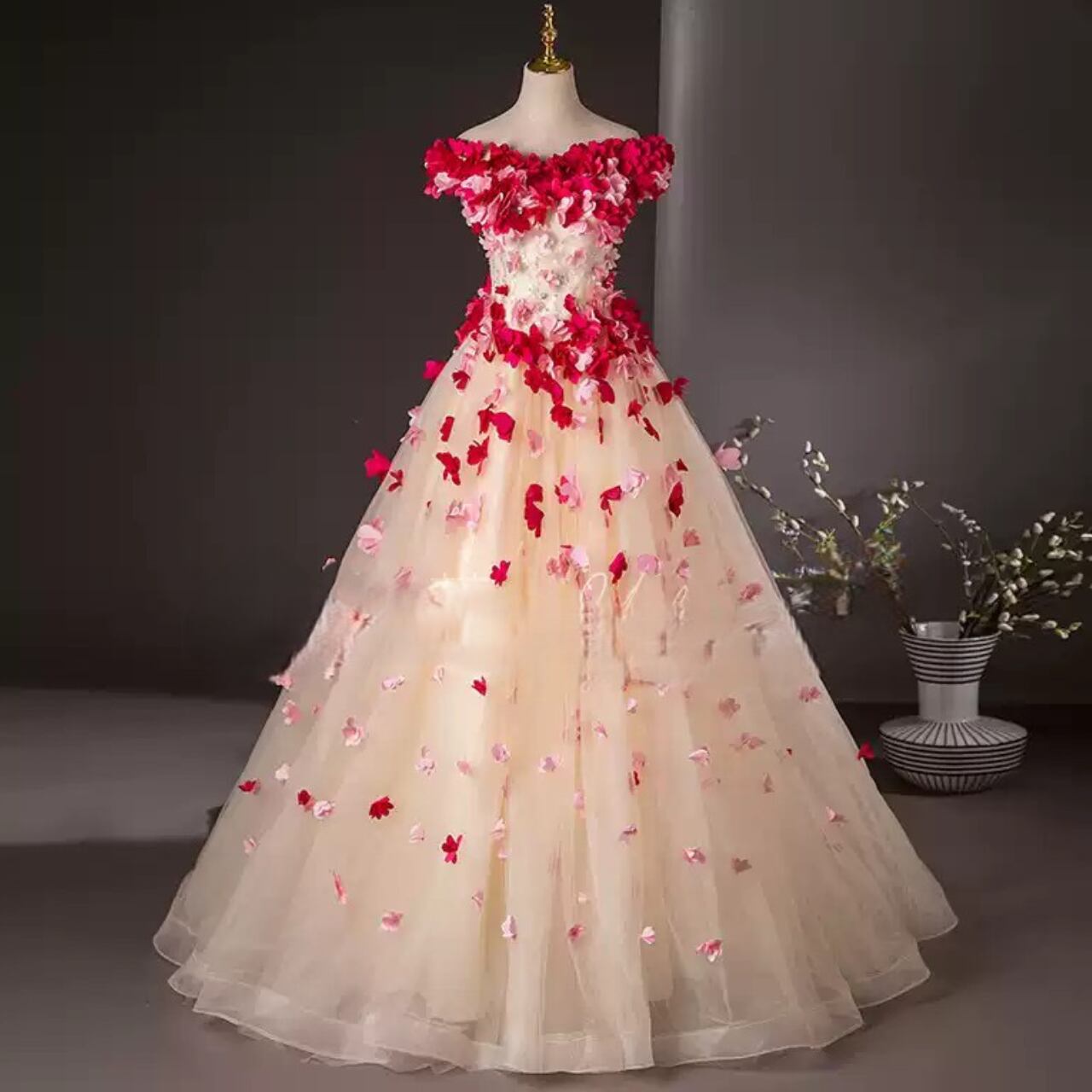 フラワーモチーフオフショルダーAラインチュールドレス CL0223