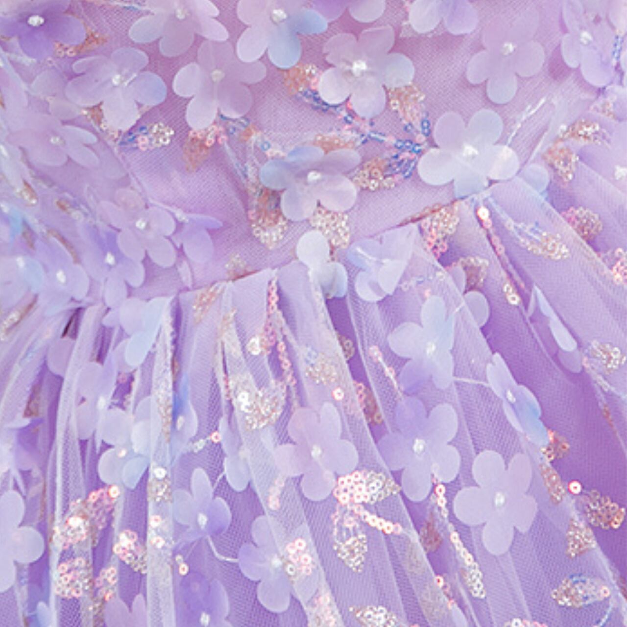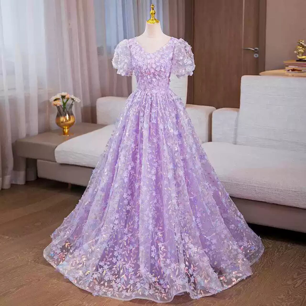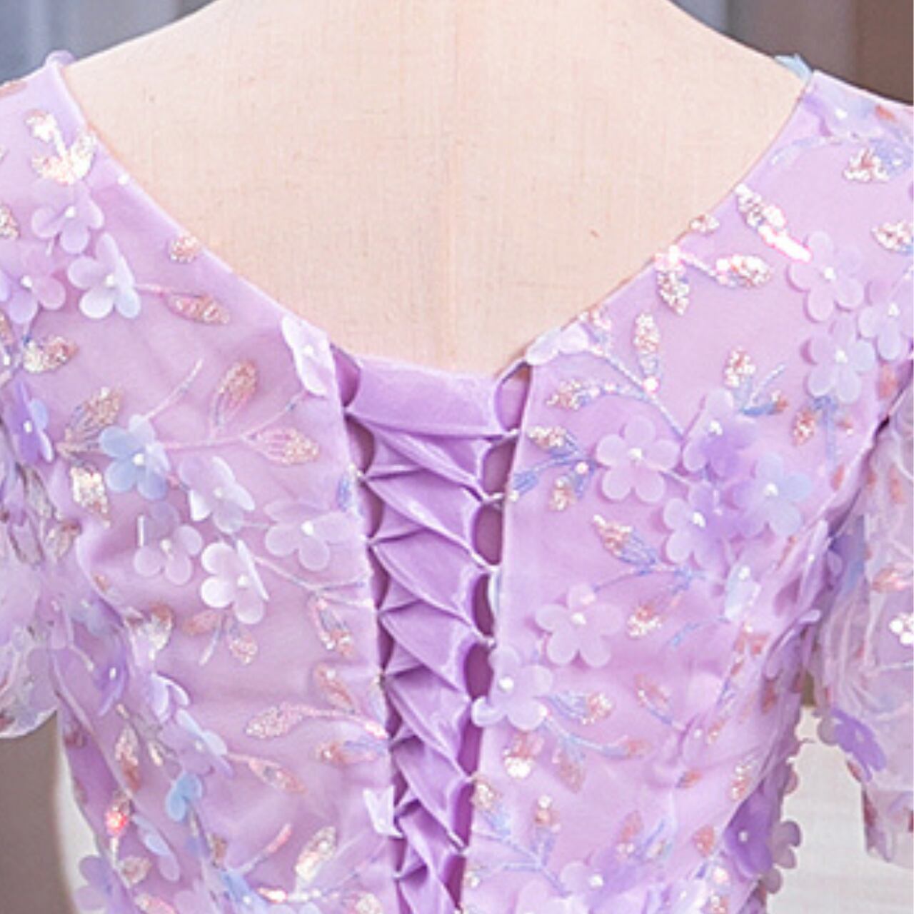 アプリコットエンブロイダリー Vネックパフスリーブドレス CL0229