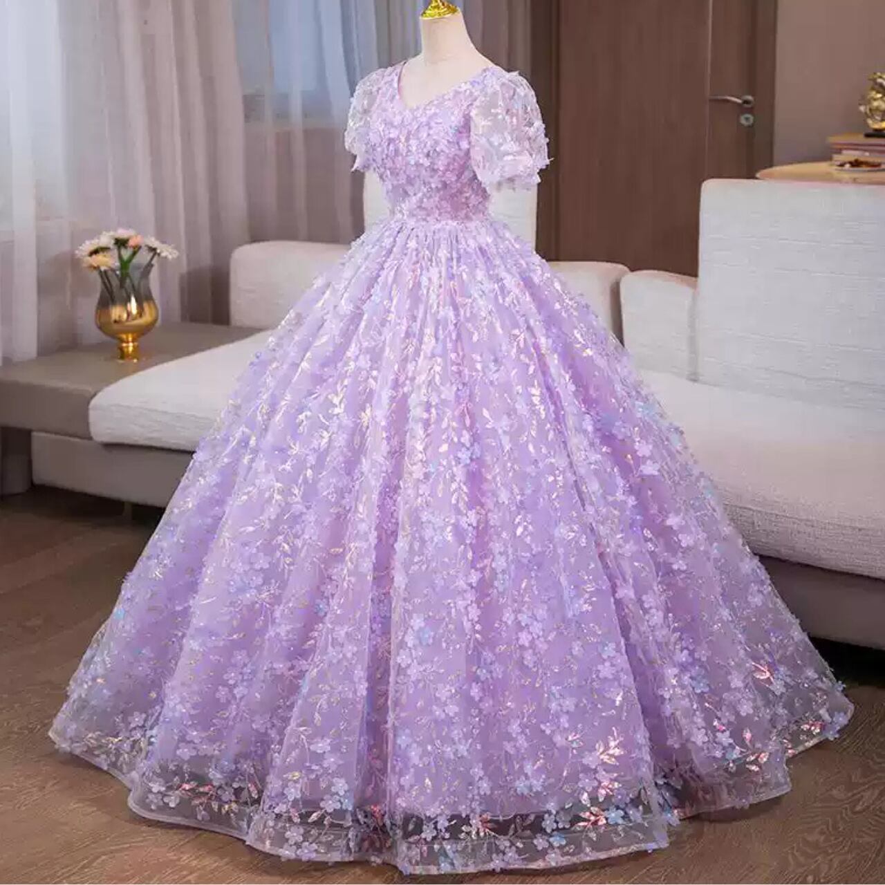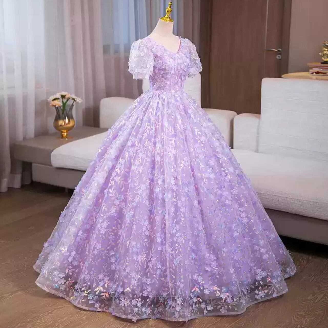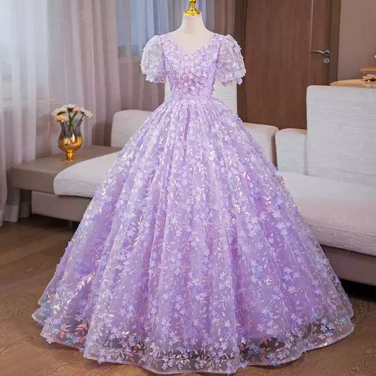 アプリコットエンブロイダリー Vネックパフスリーブドレス CL0229