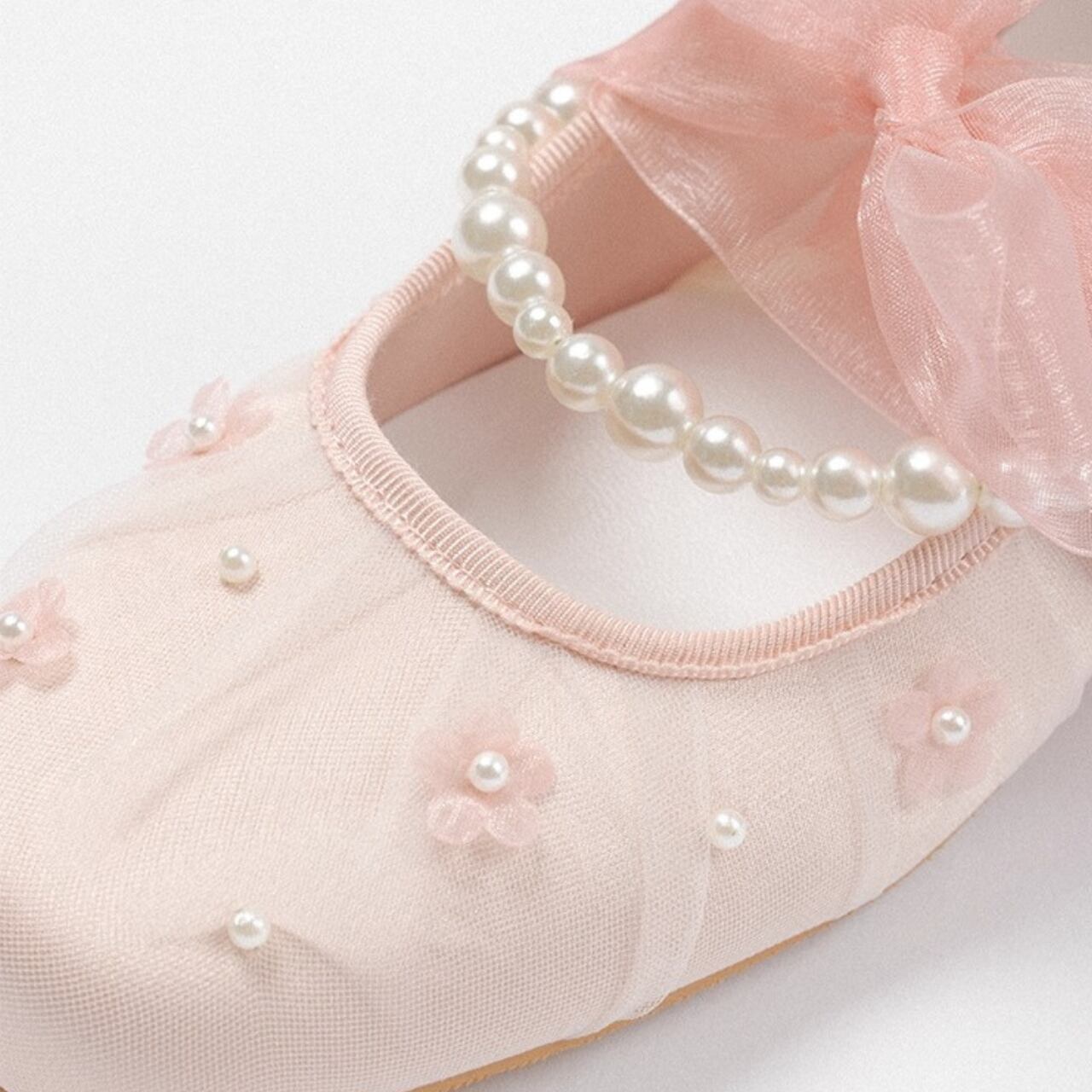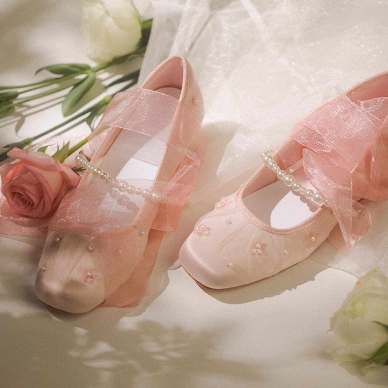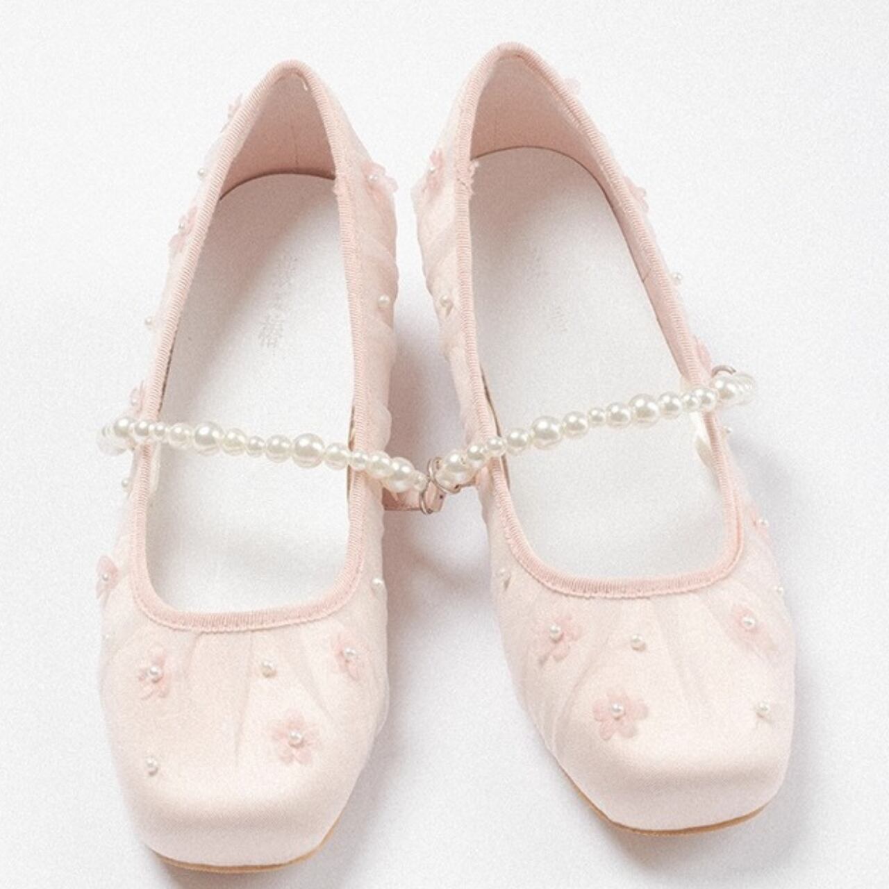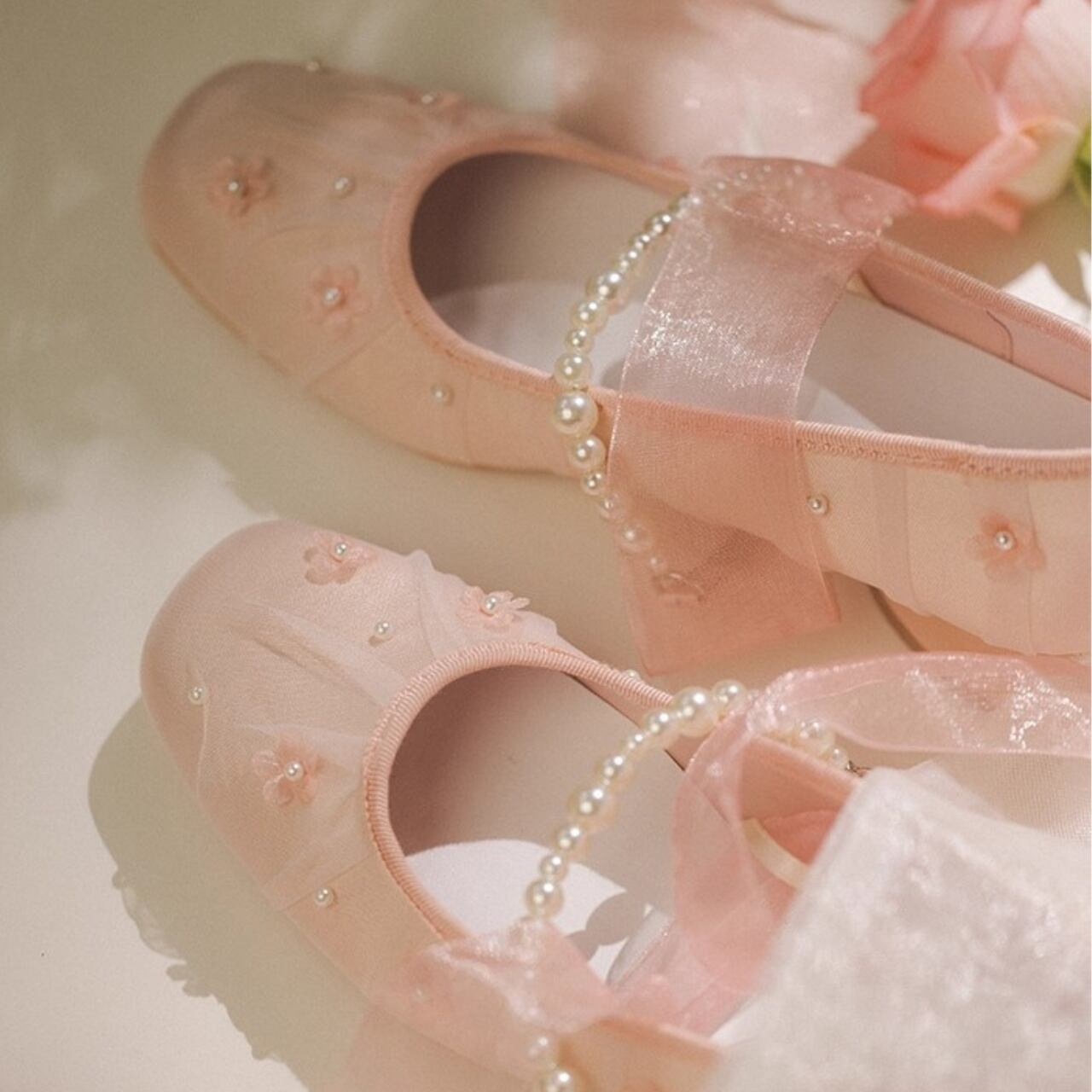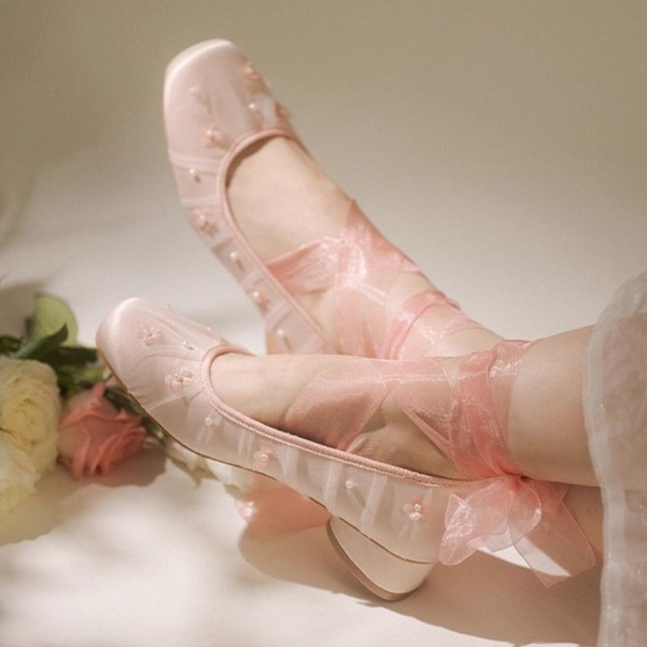 メッシュ刺繍アンクルストラップローヒールパンプス CL0238