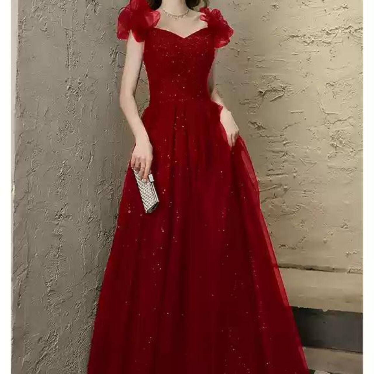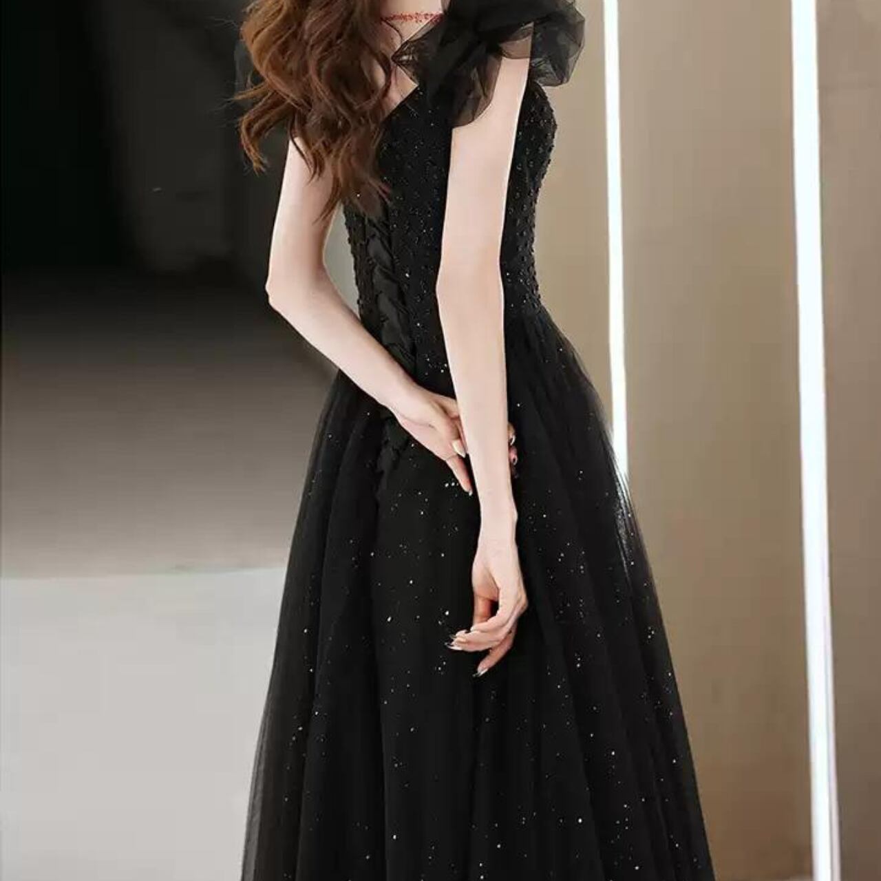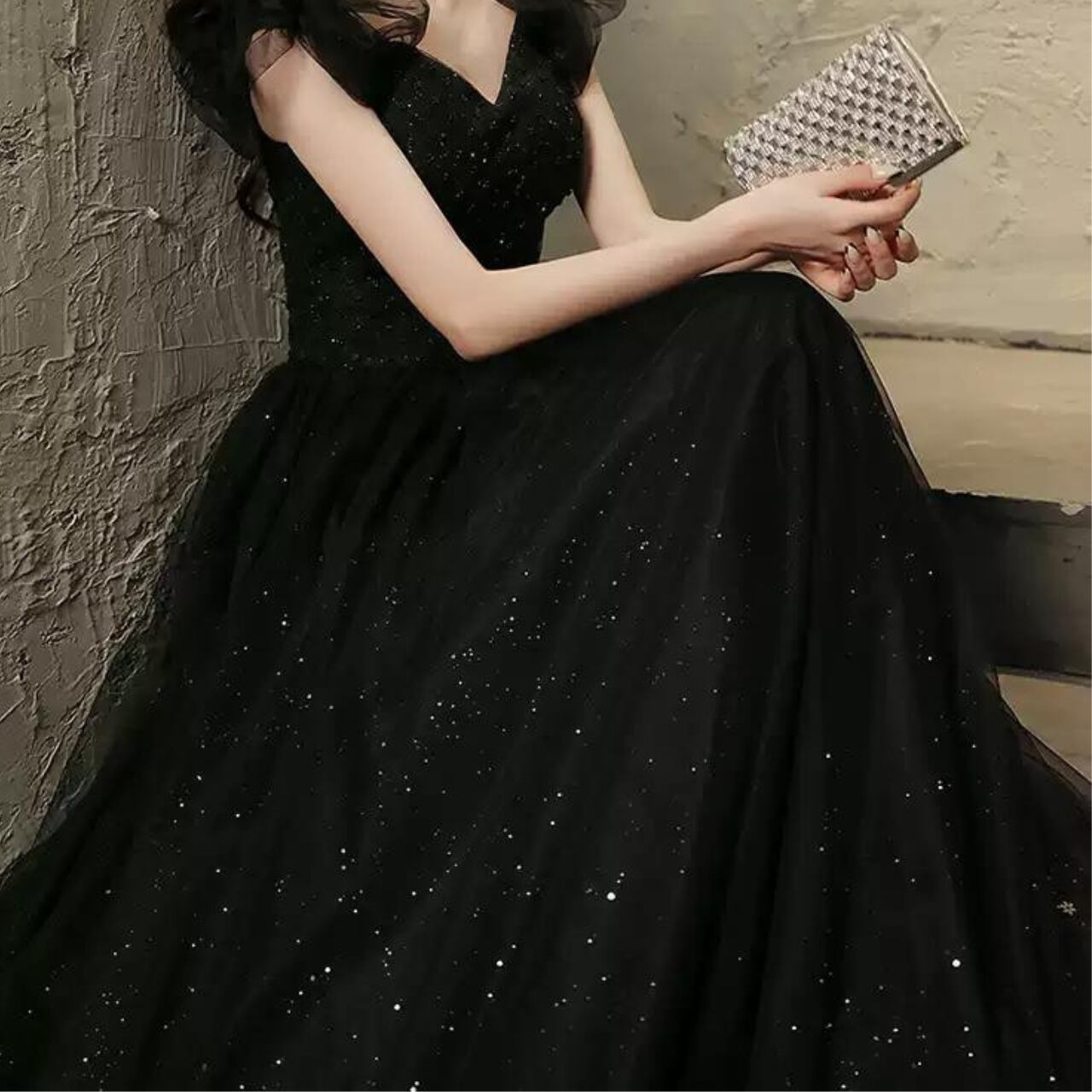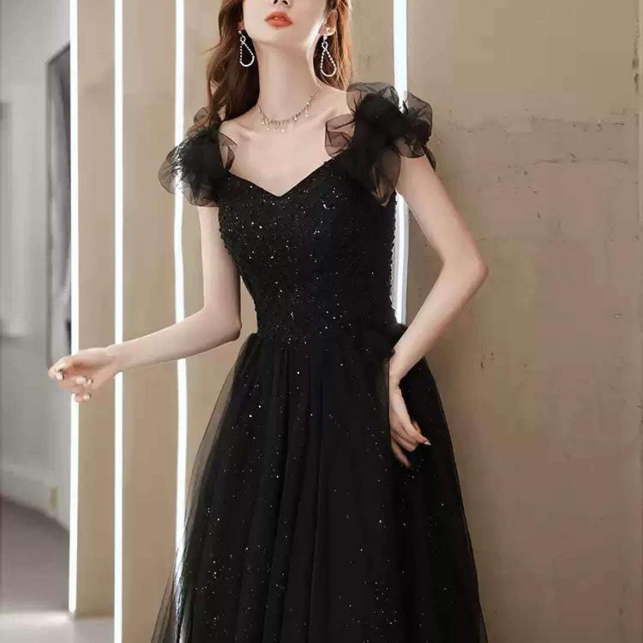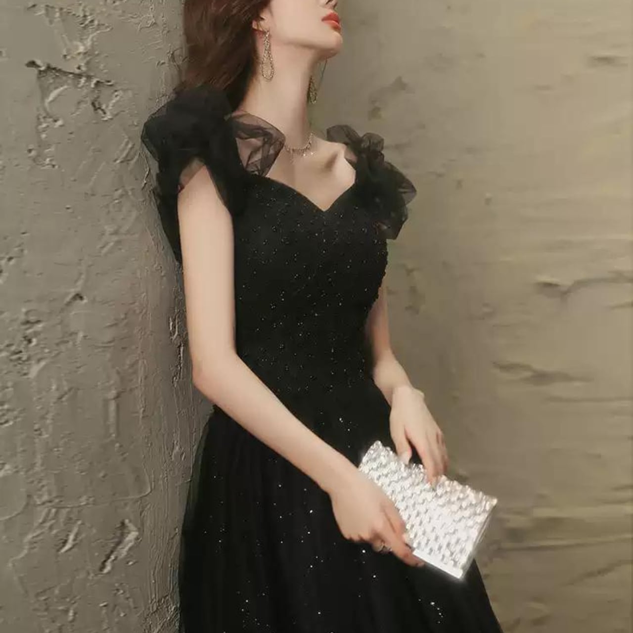 フリル袖ラメドレス ブラック/レッド CL0008