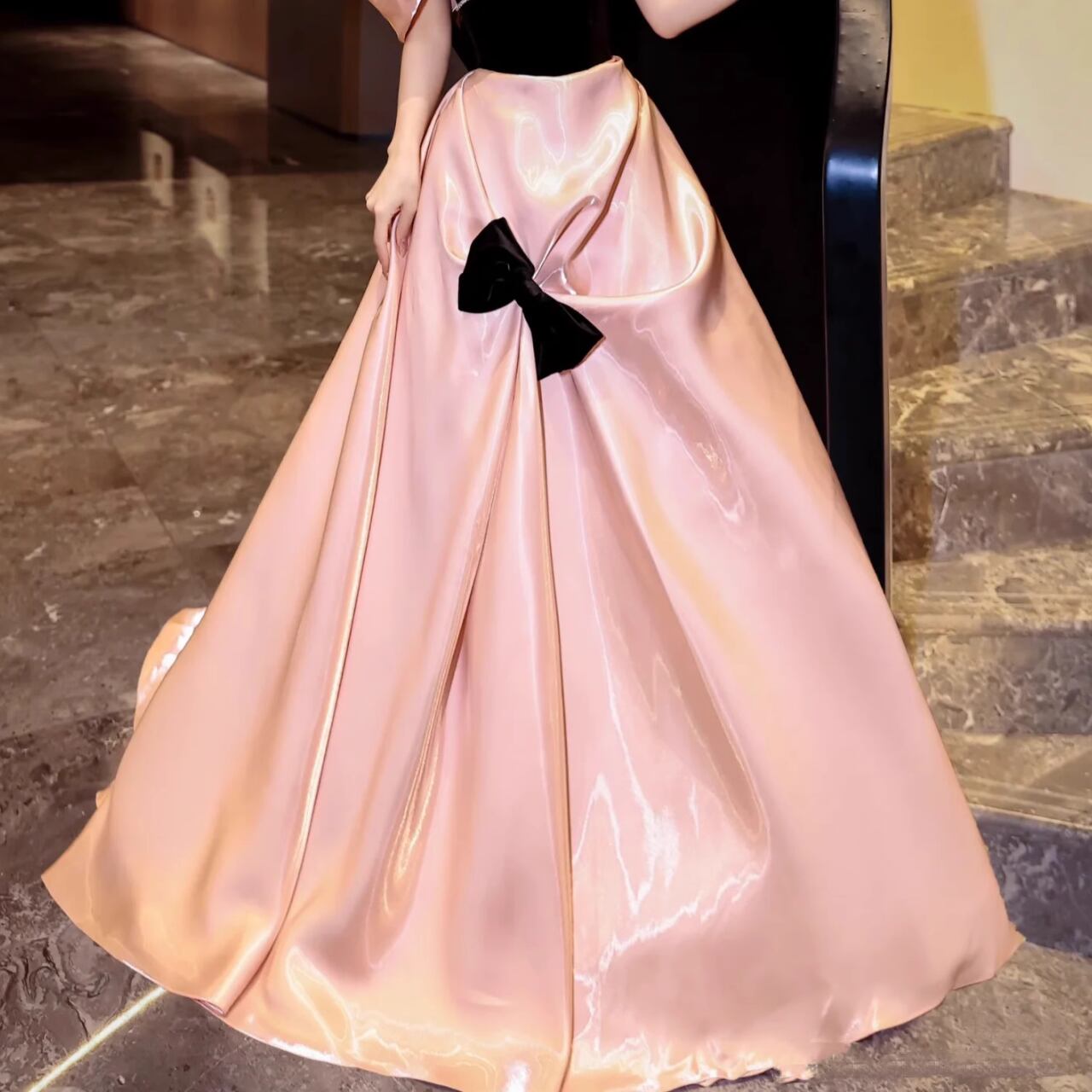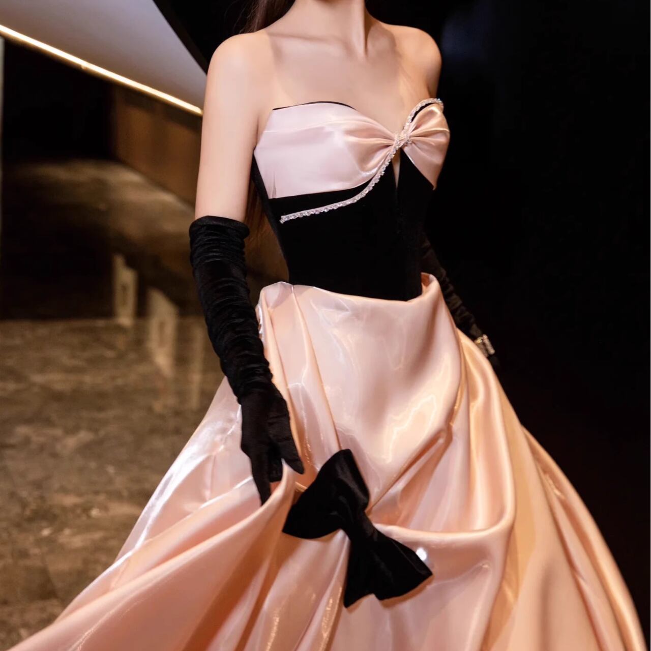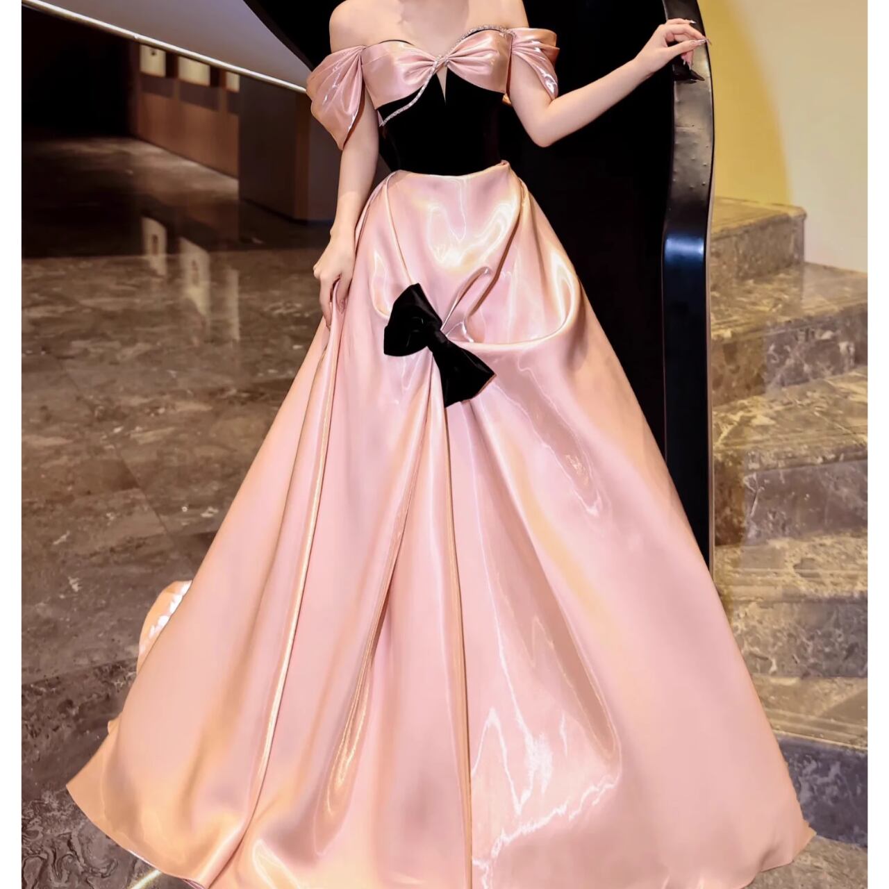サテン地リボン装飾ボートネックロングスカート CL0088