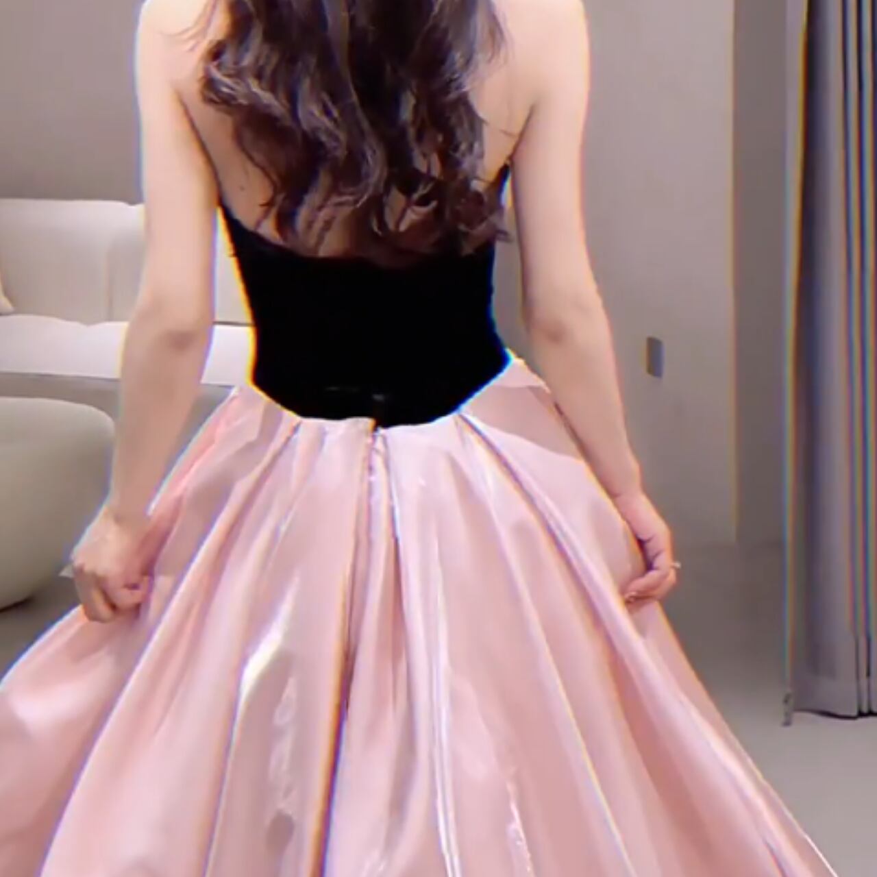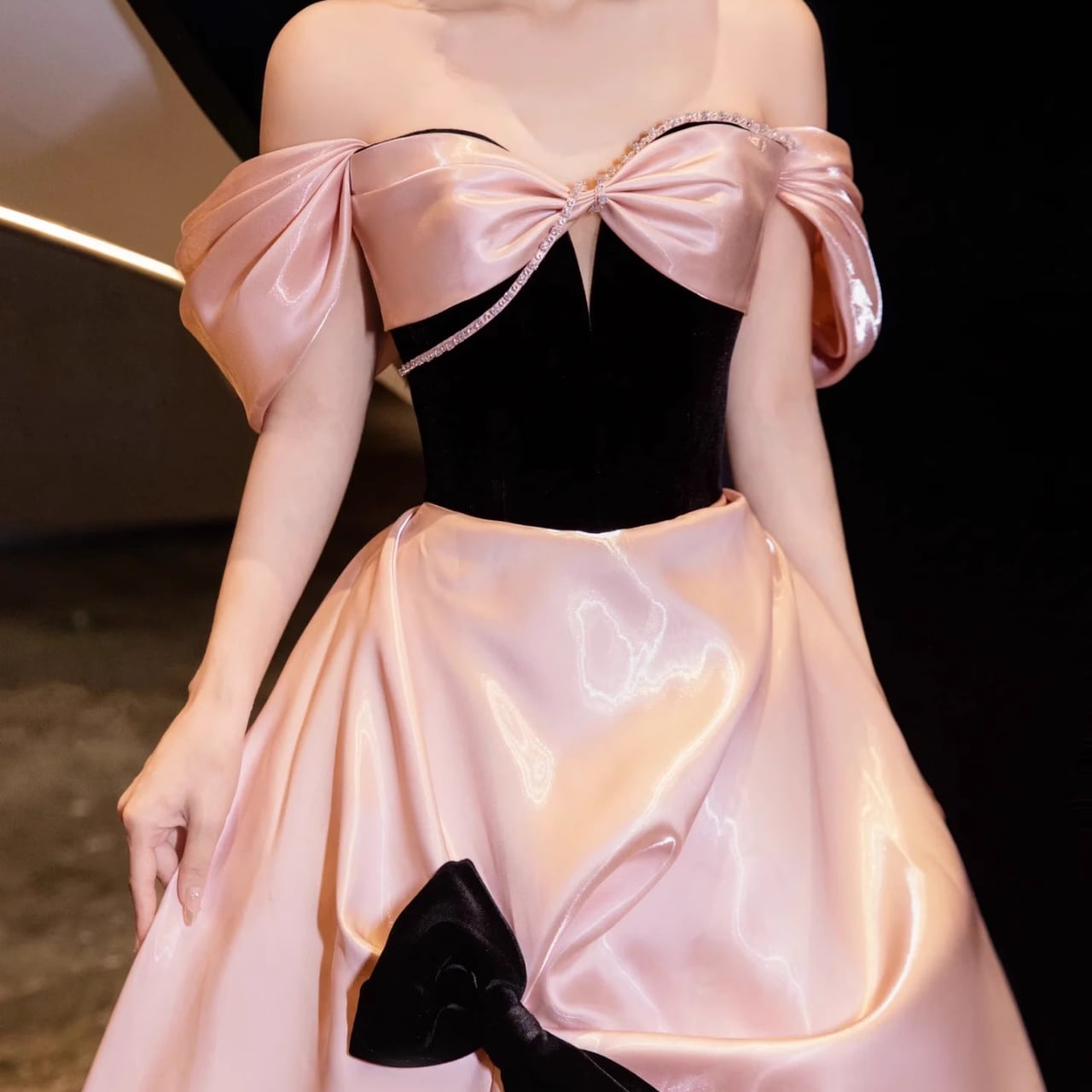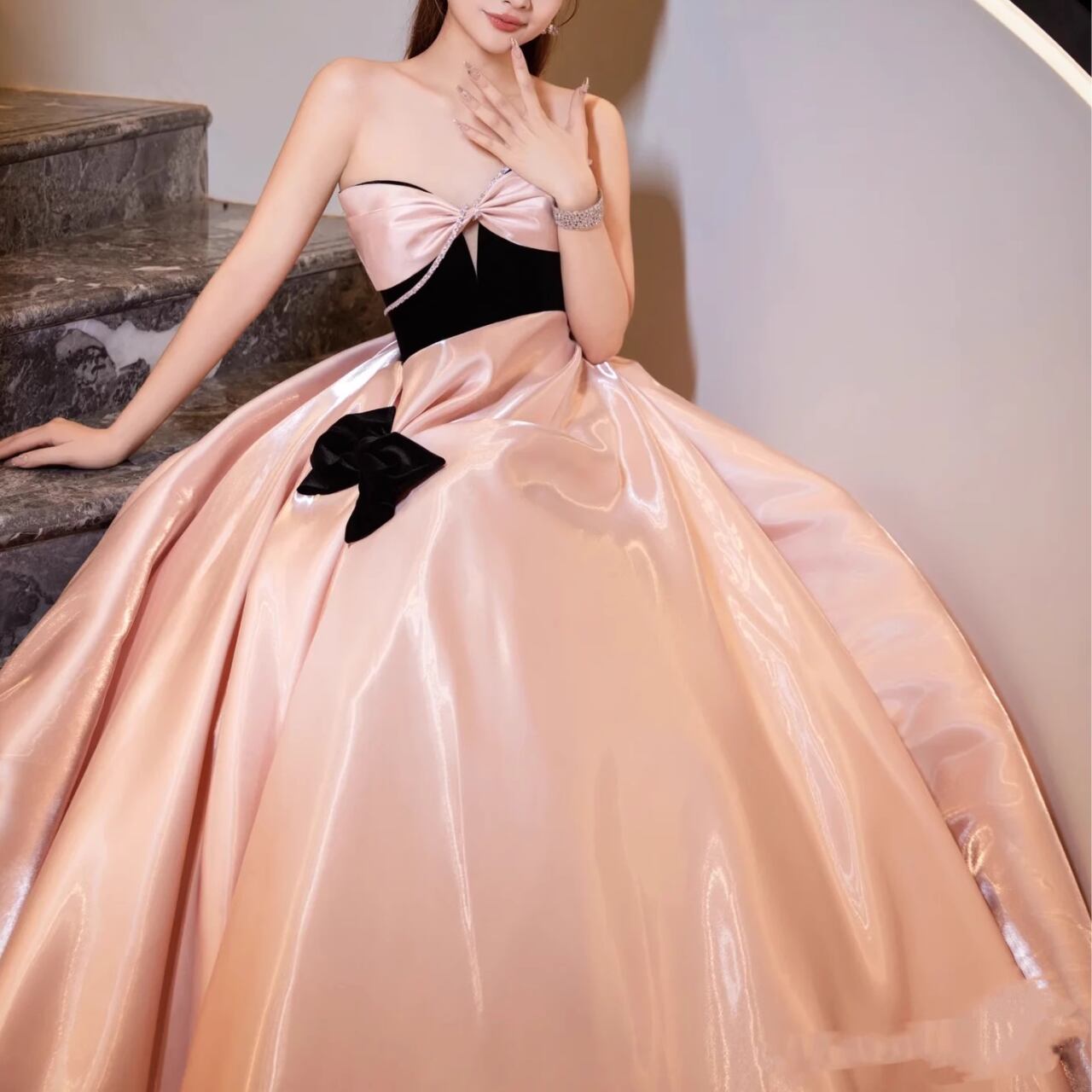 サテン地リボン装飾ボートネックロングスカート CL0088