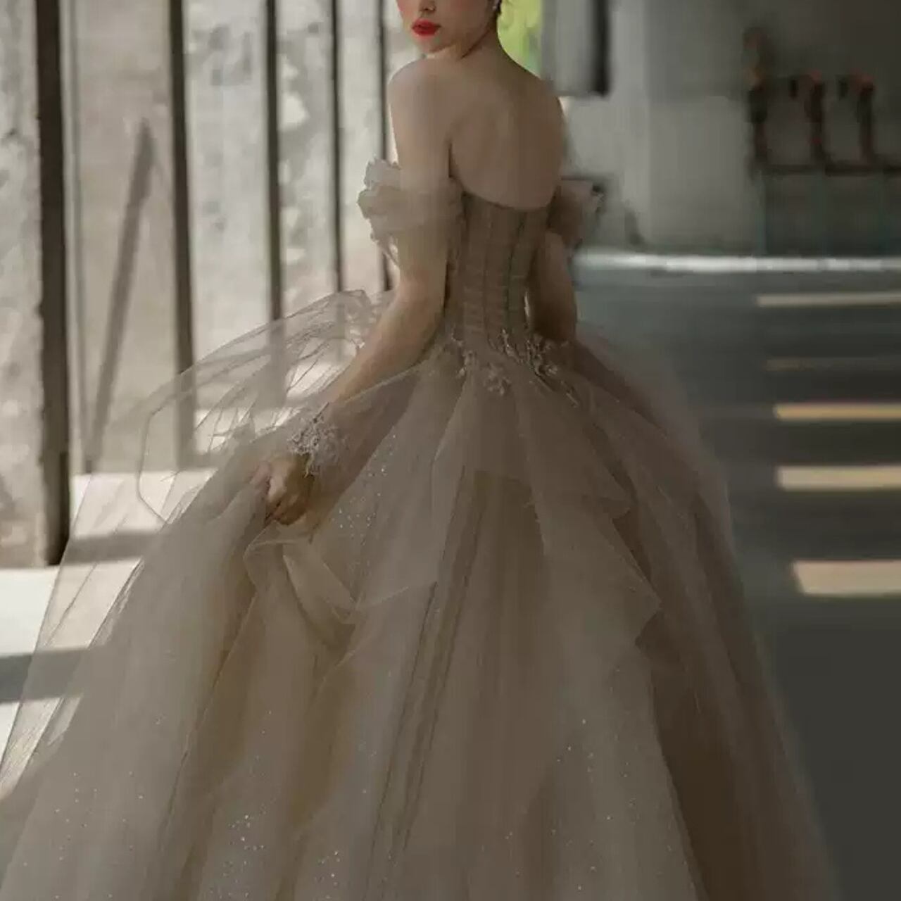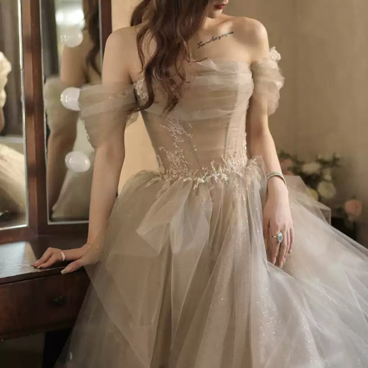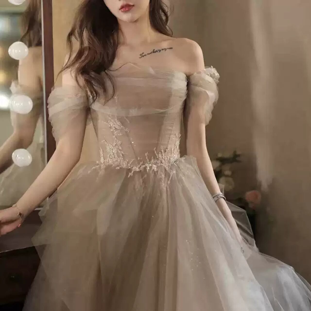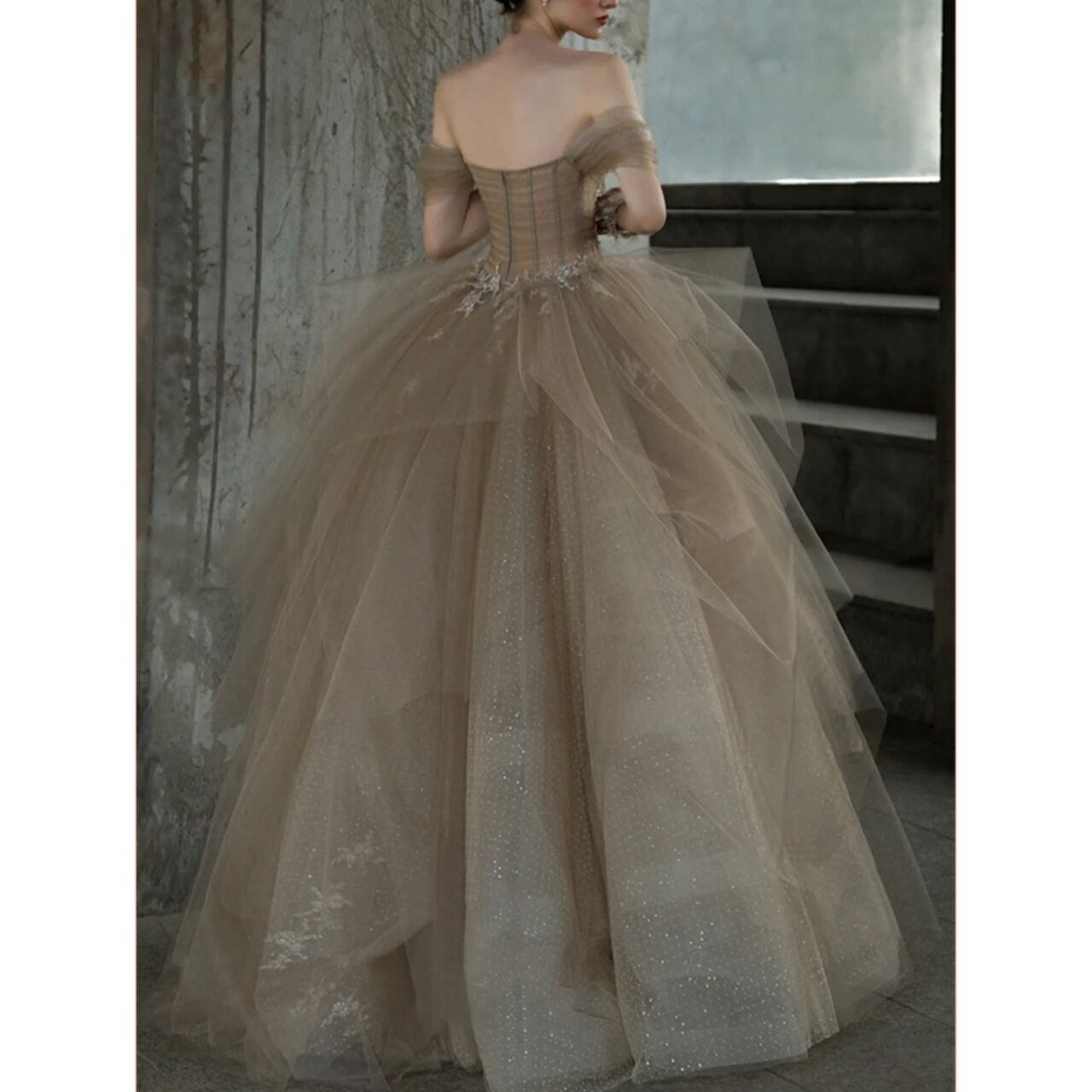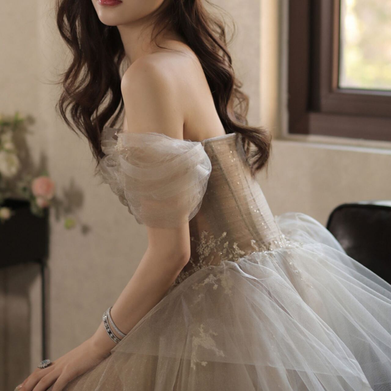 オフショルダー刺繍Aラインチュールドレス CL0112