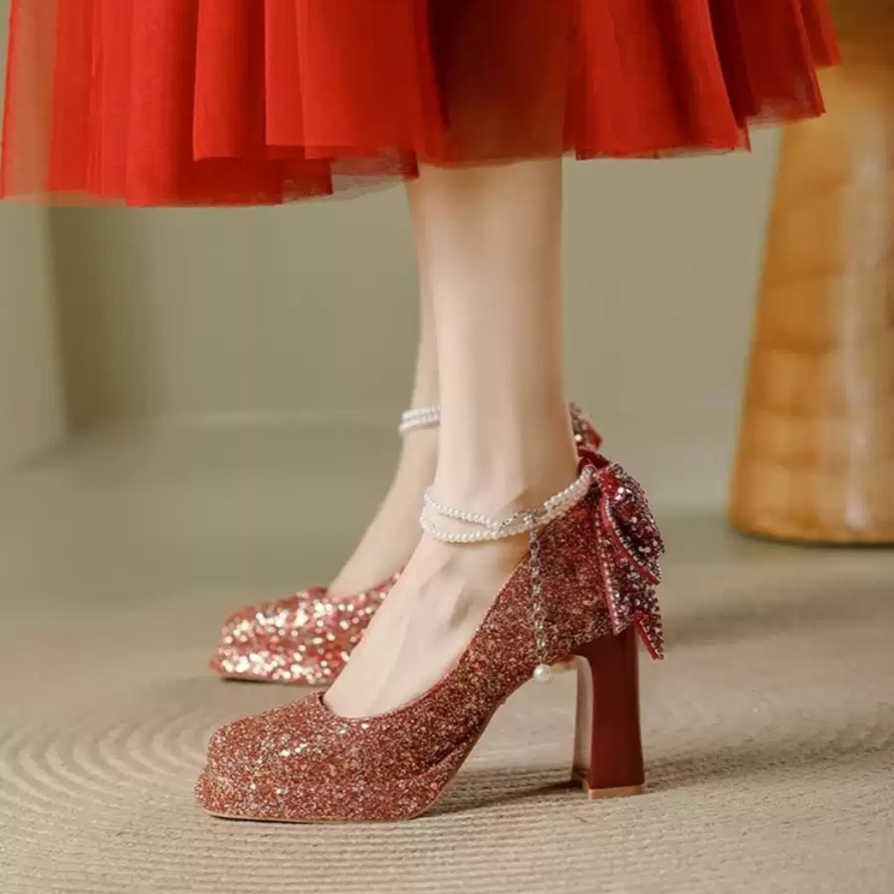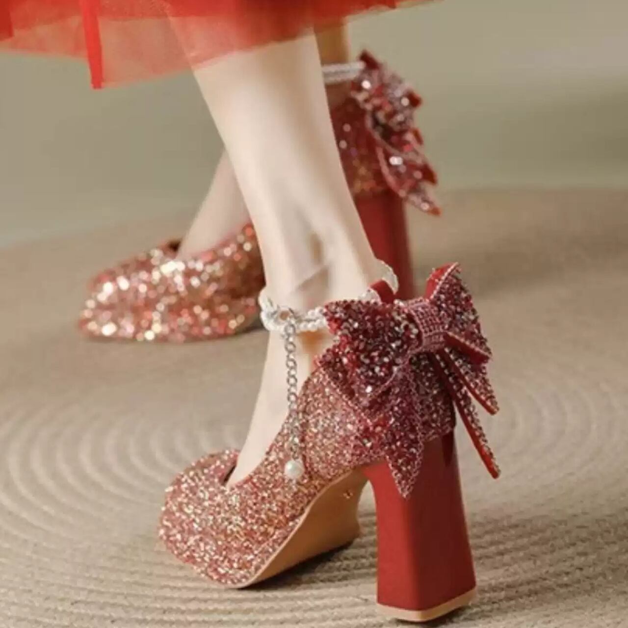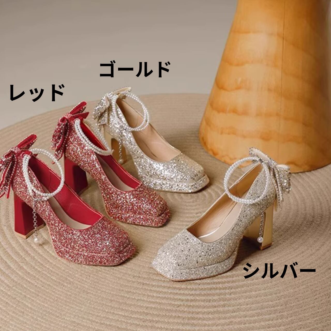 キラキラビジュー装飾アンクルストラップパンプスゴールド/シルバー/レッド CL0113