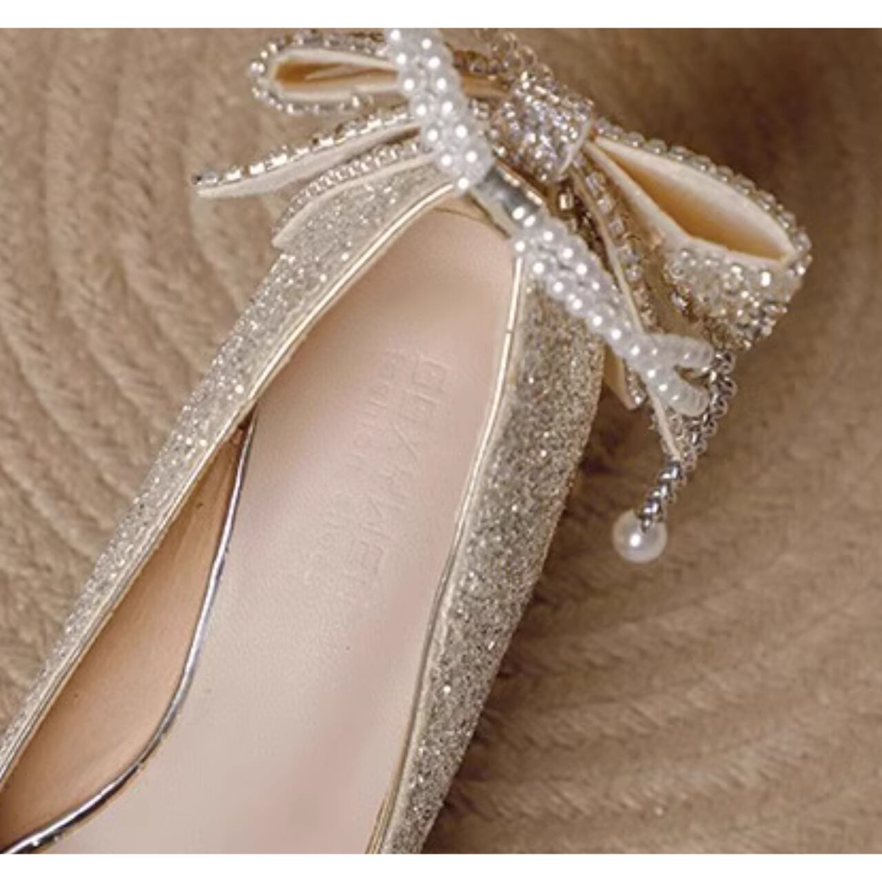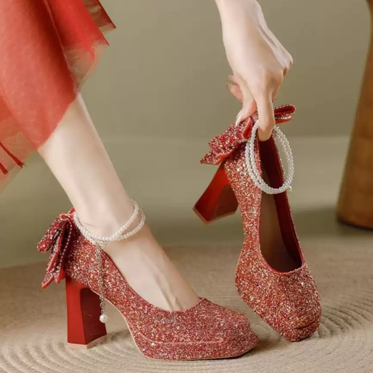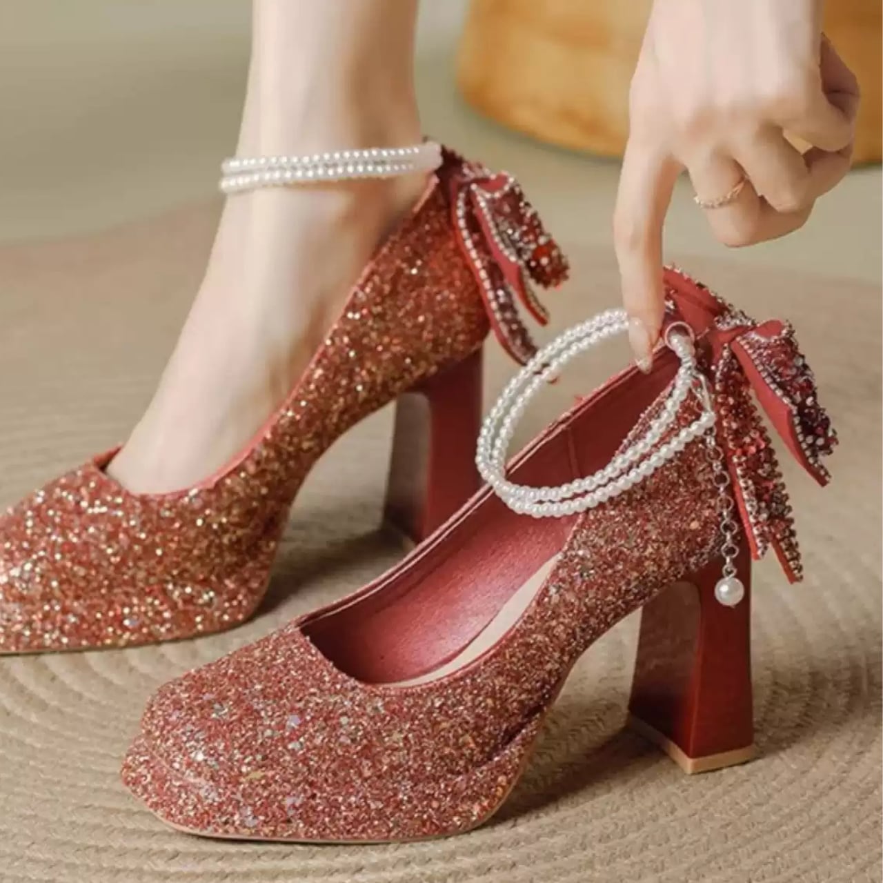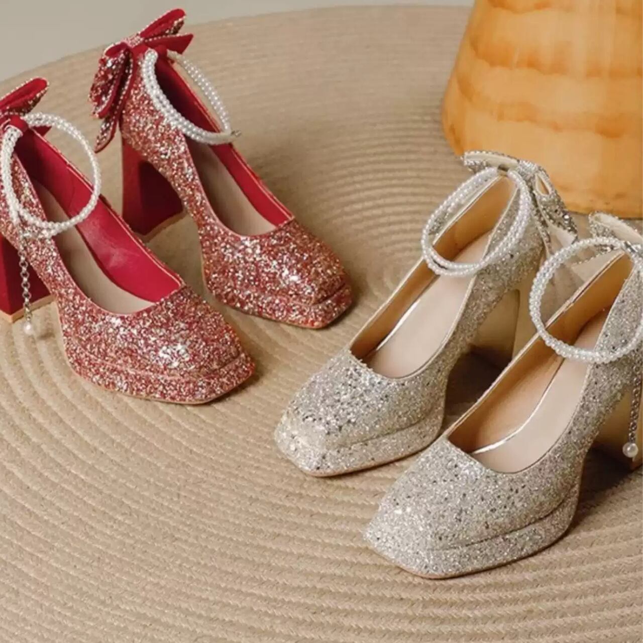 キラキラビジュー装飾アンクルストラップパンプスゴールド/シルバー/レッド CL0113