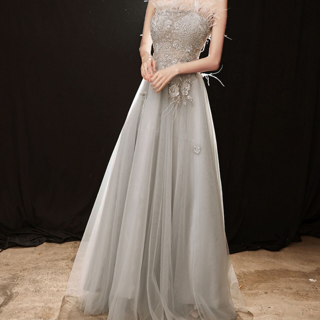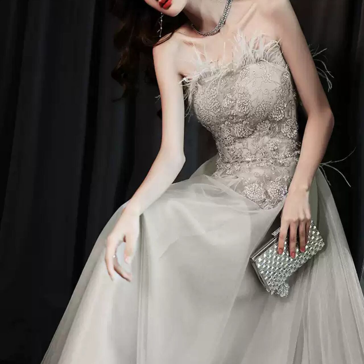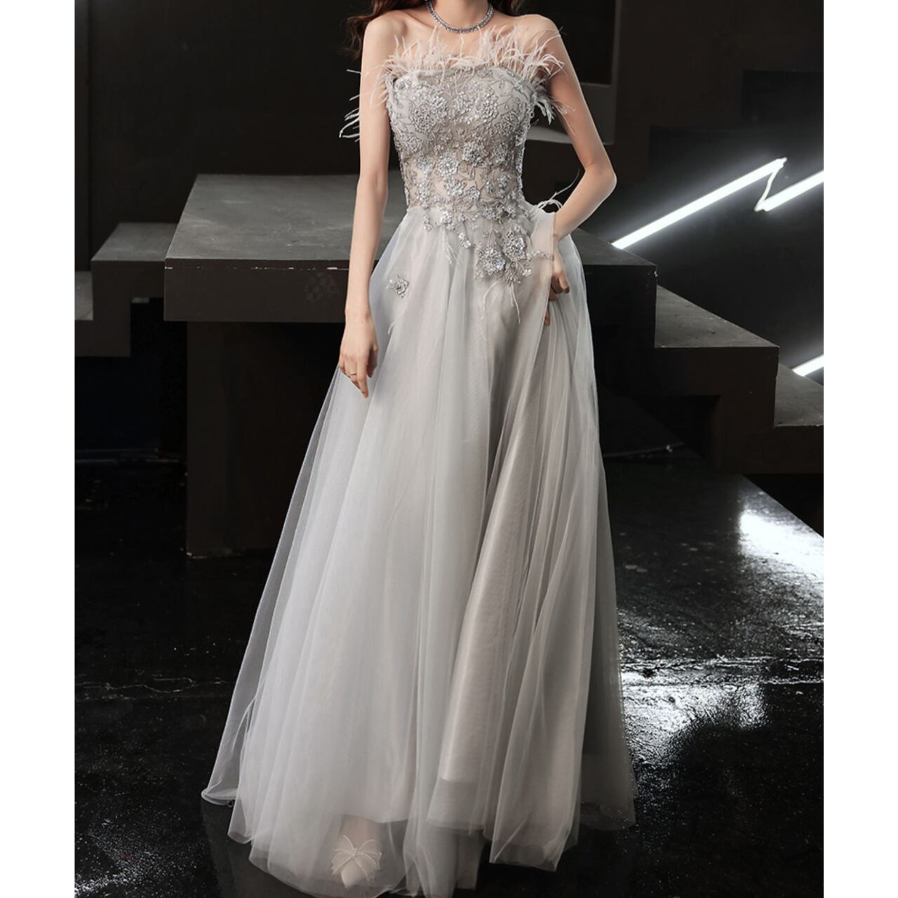 チューブトップビジュー装飾Aラインドレス CL0118