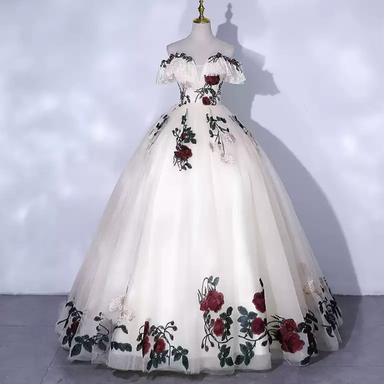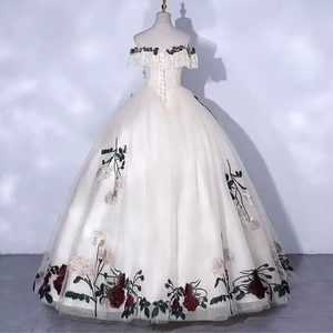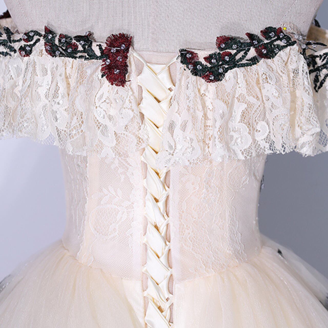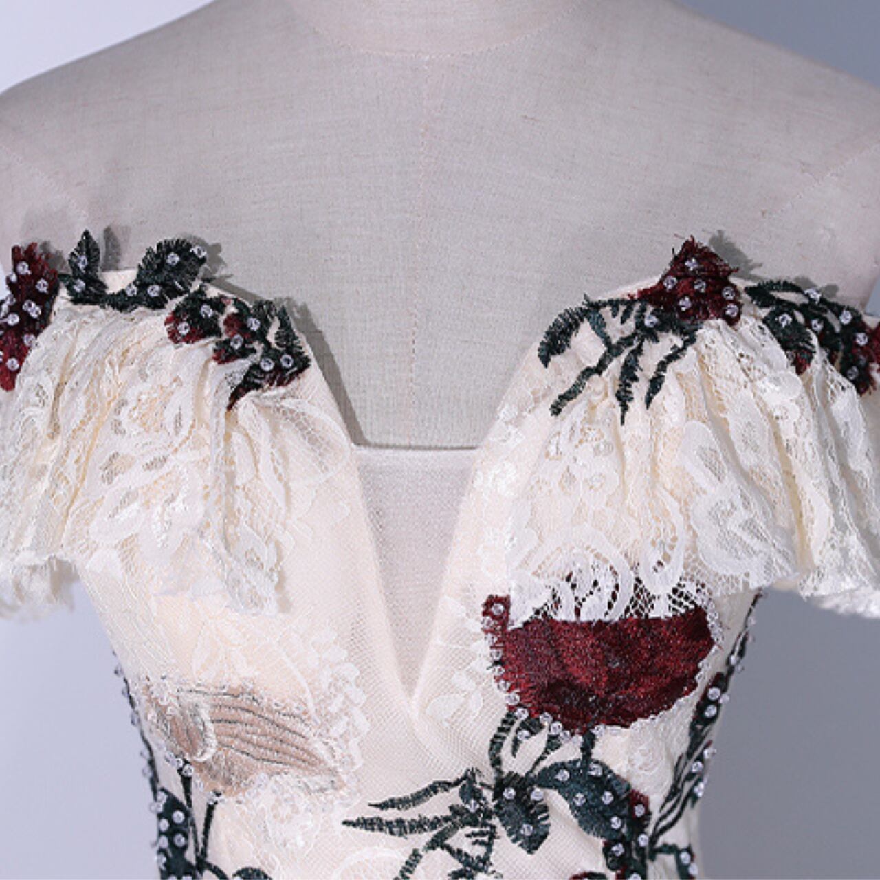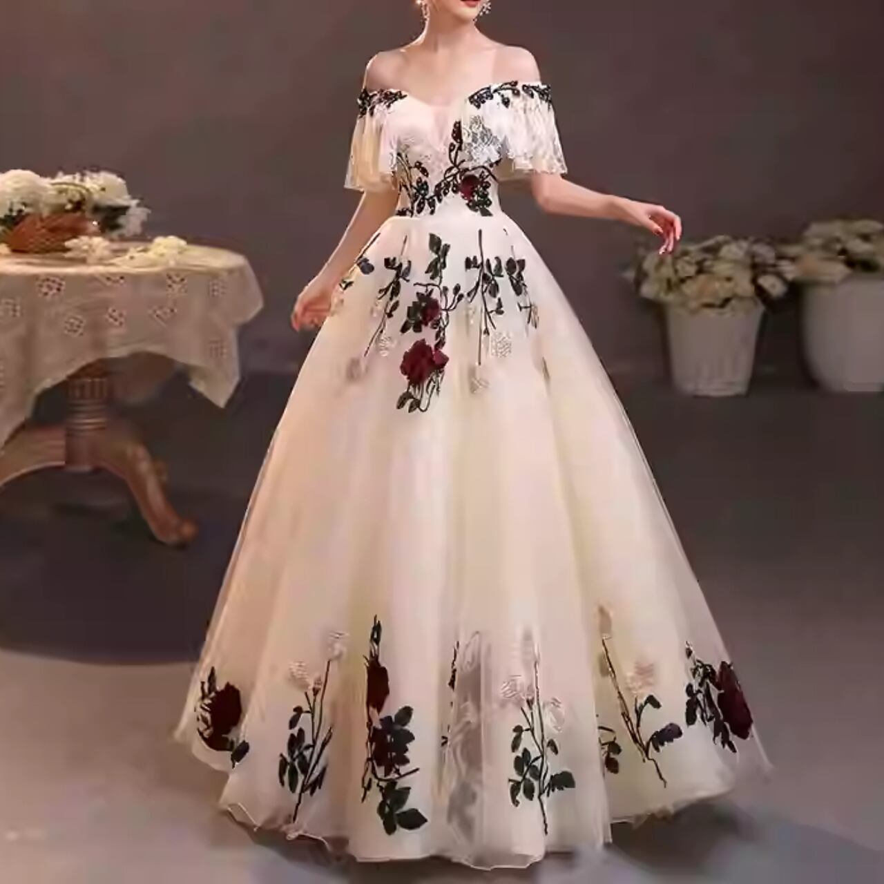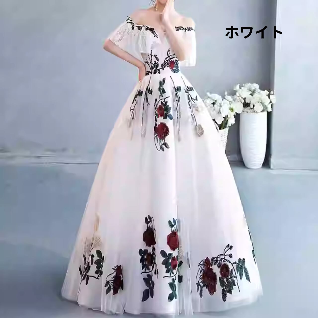 オフショルダーバースリーブ刺繍ドレス シャンパン/ホワイト/ミルキーホワイト CL0119