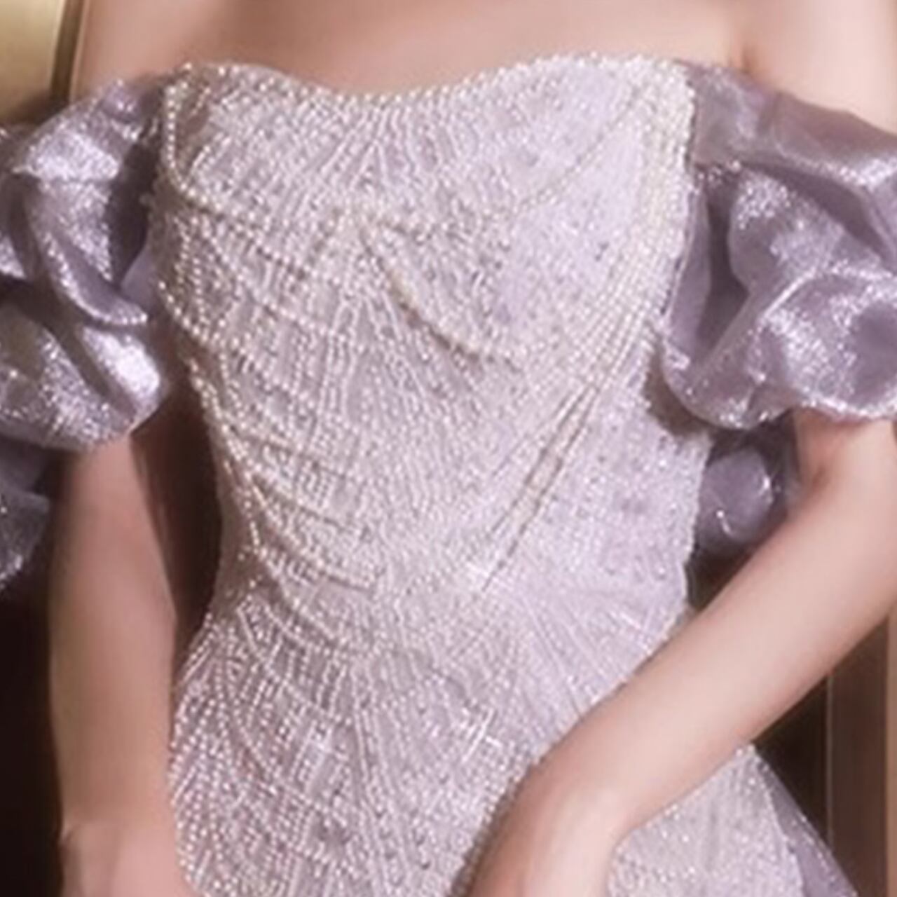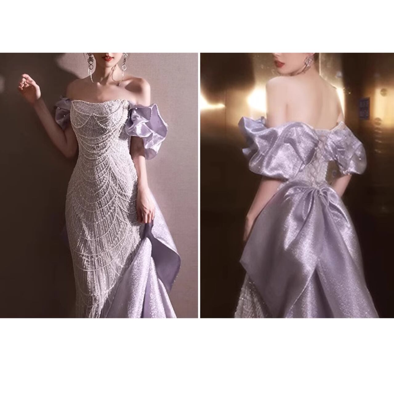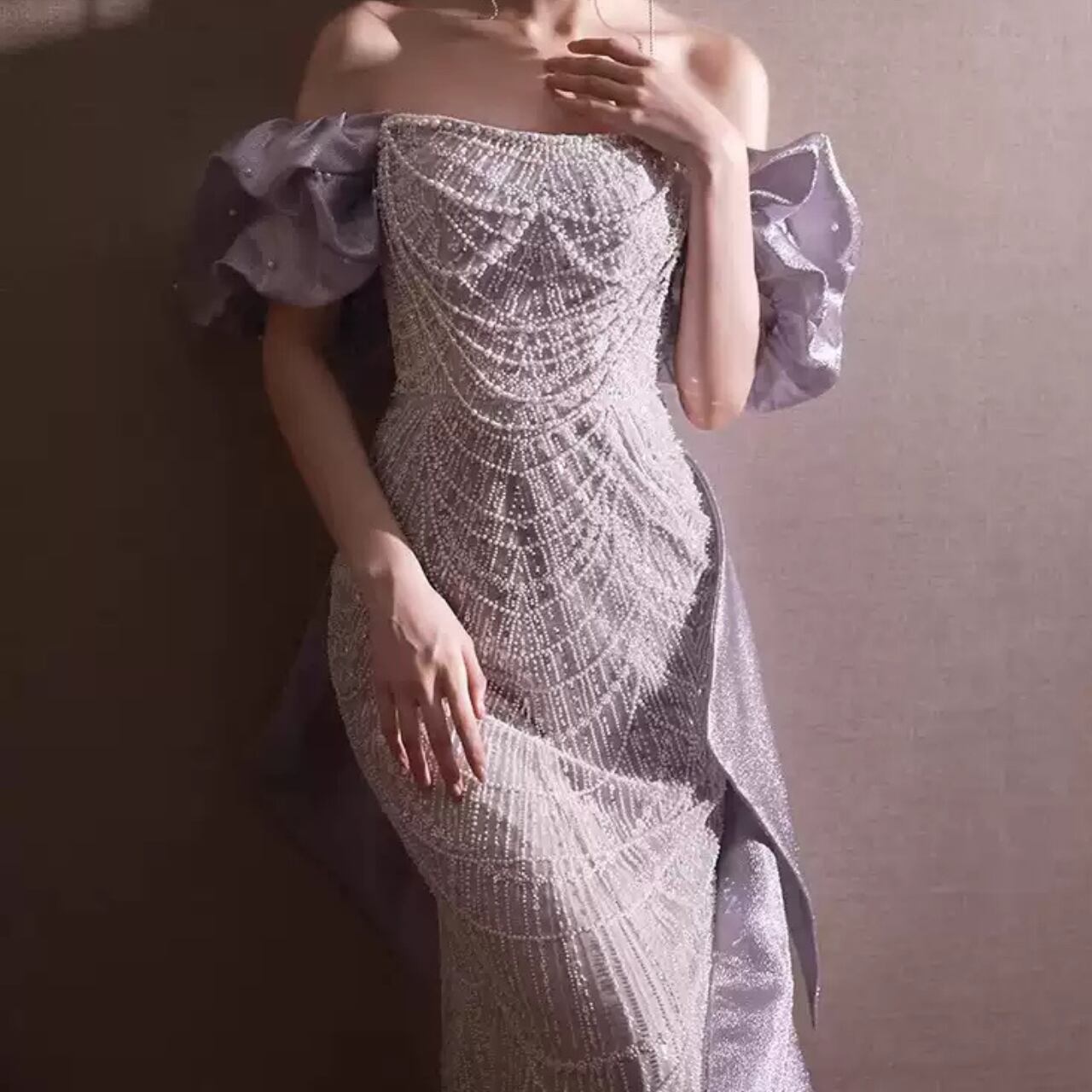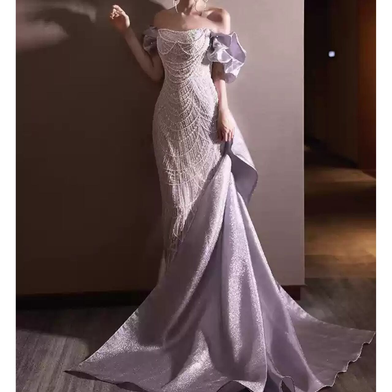 ビーズ装飾オフショルダーパフスリーブマーメイドドレス CL0122