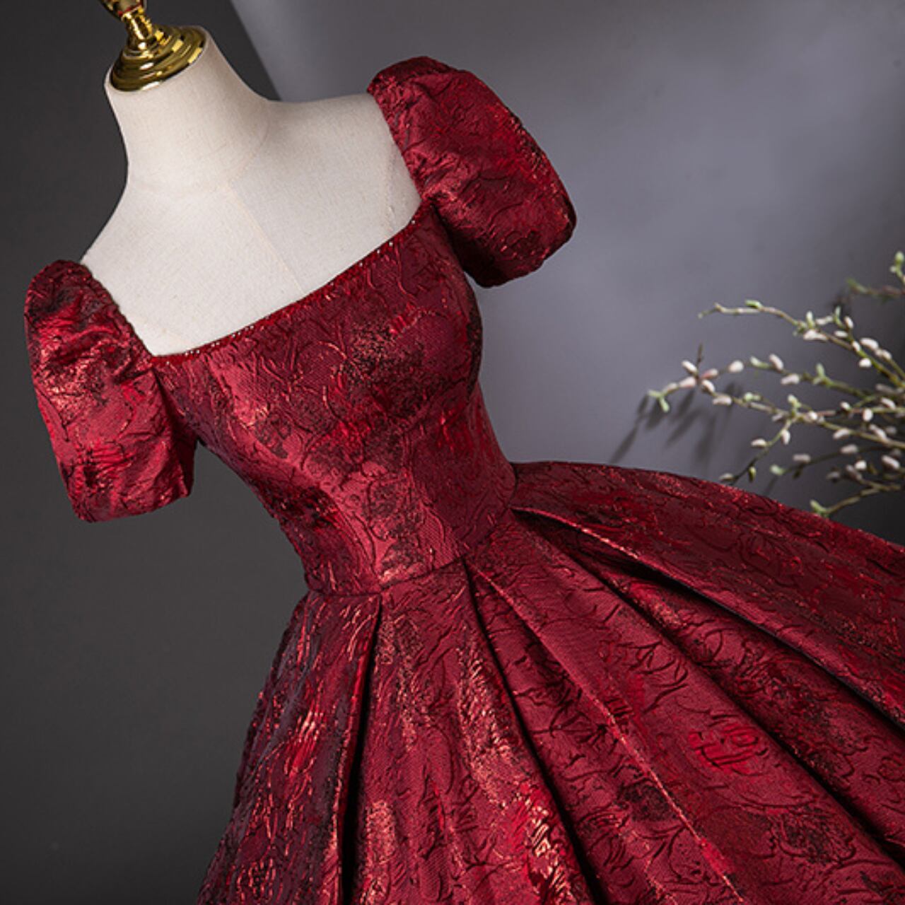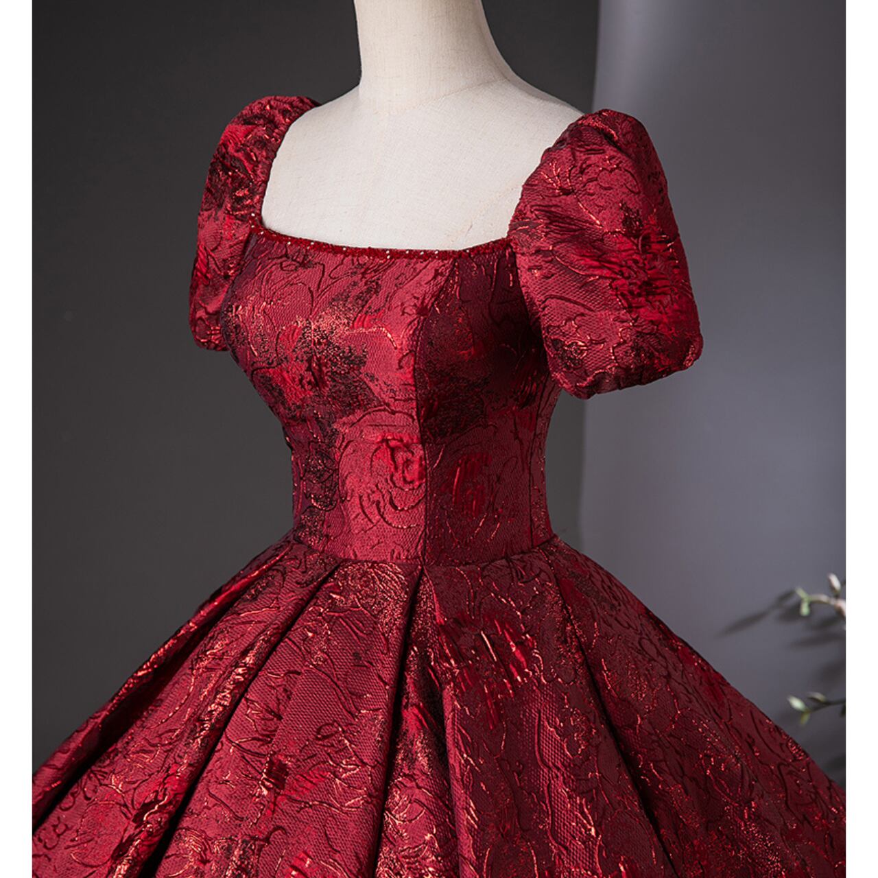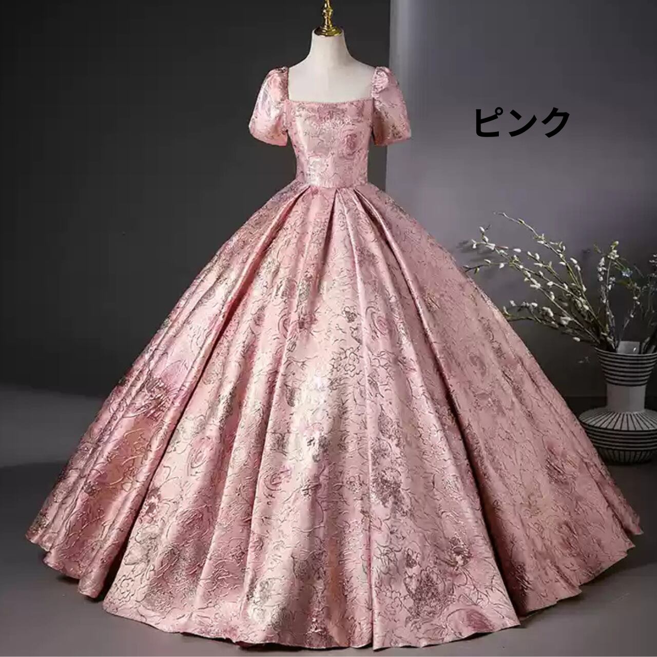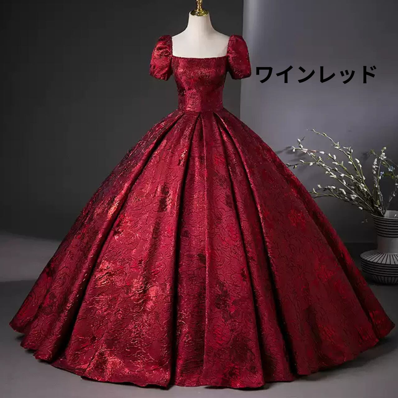 ジャカード織りスクエアネックパフスリーブドレス レッド/ピンク CL0170