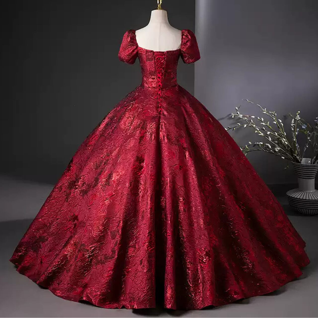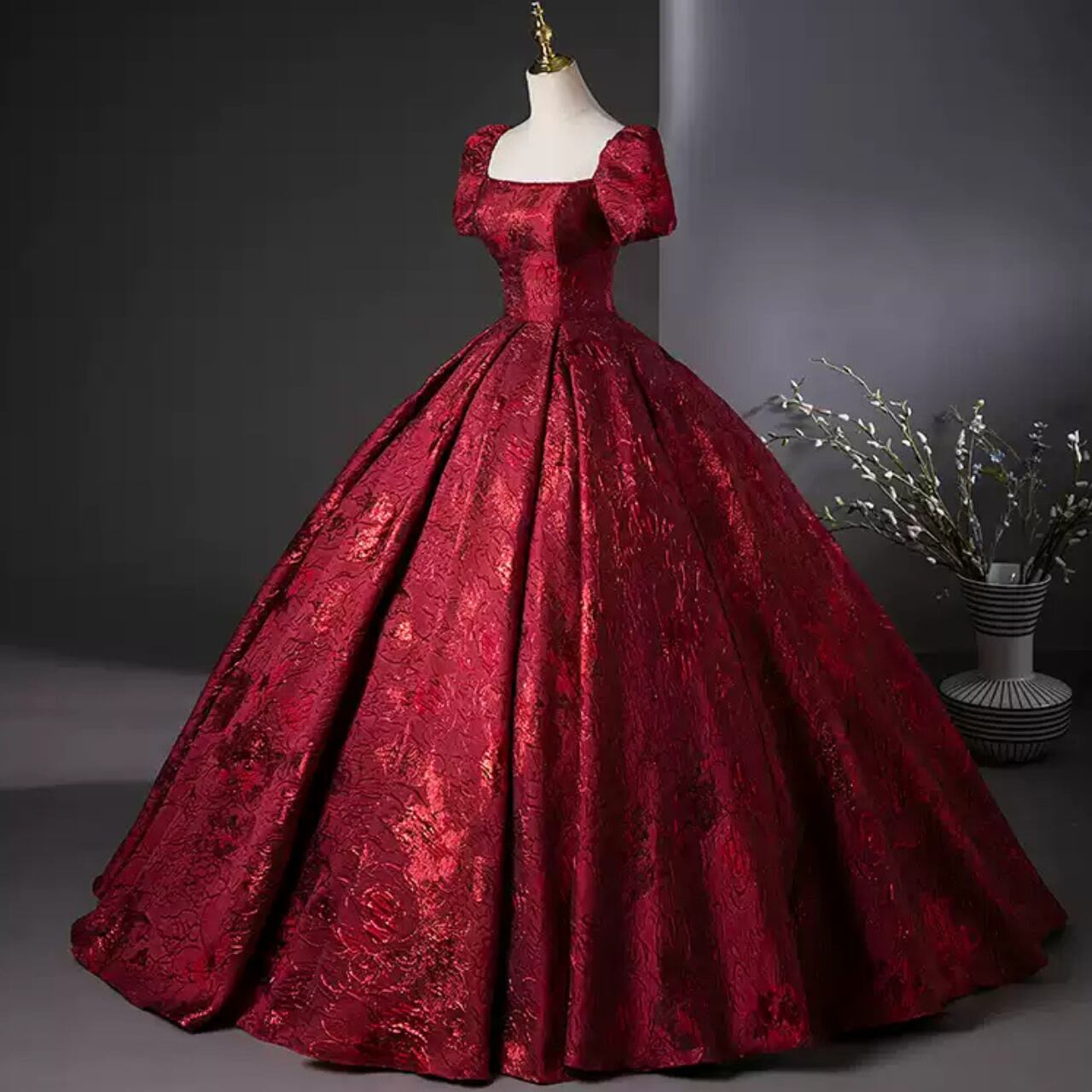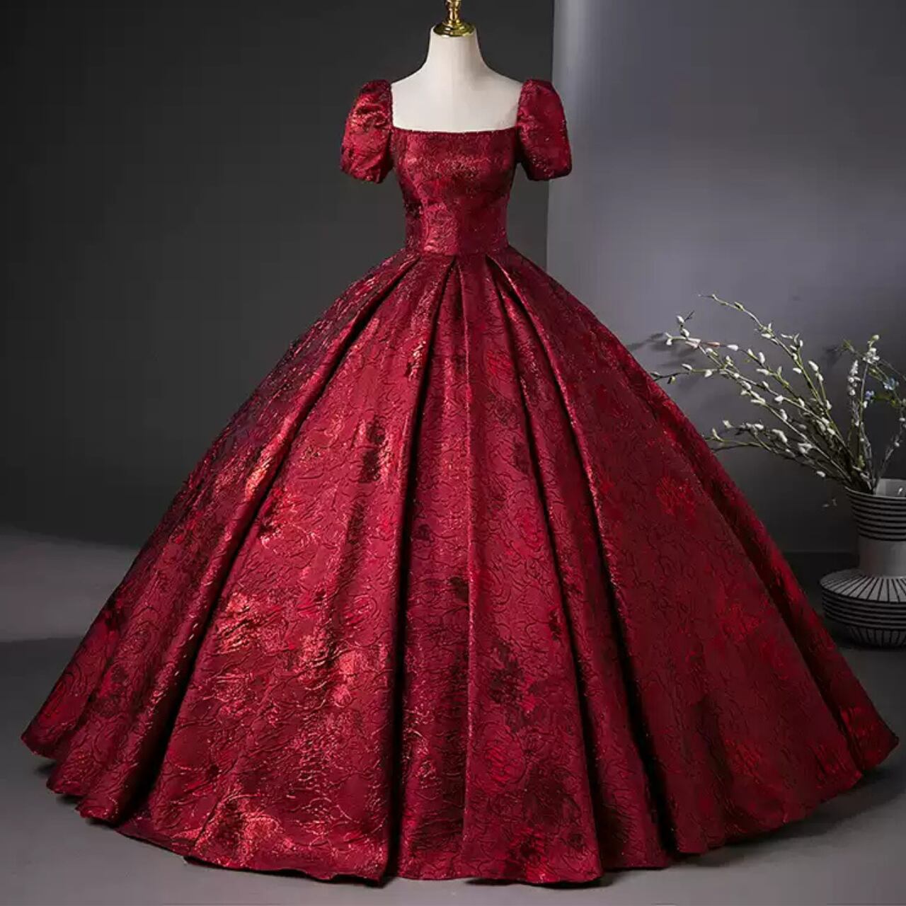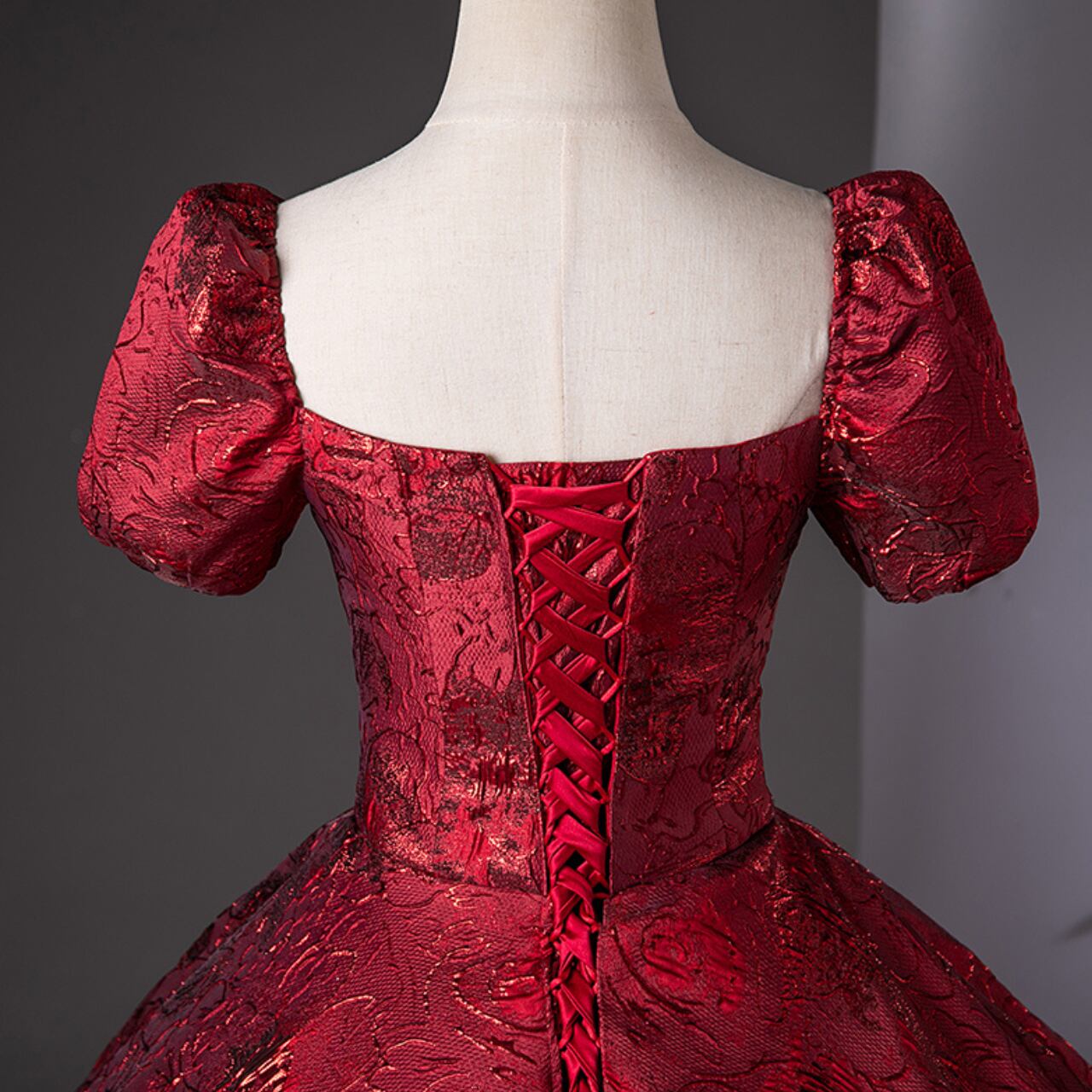 ジャカード織りスクエアネックパフスリーブドレス レッド/ピンク CL0170