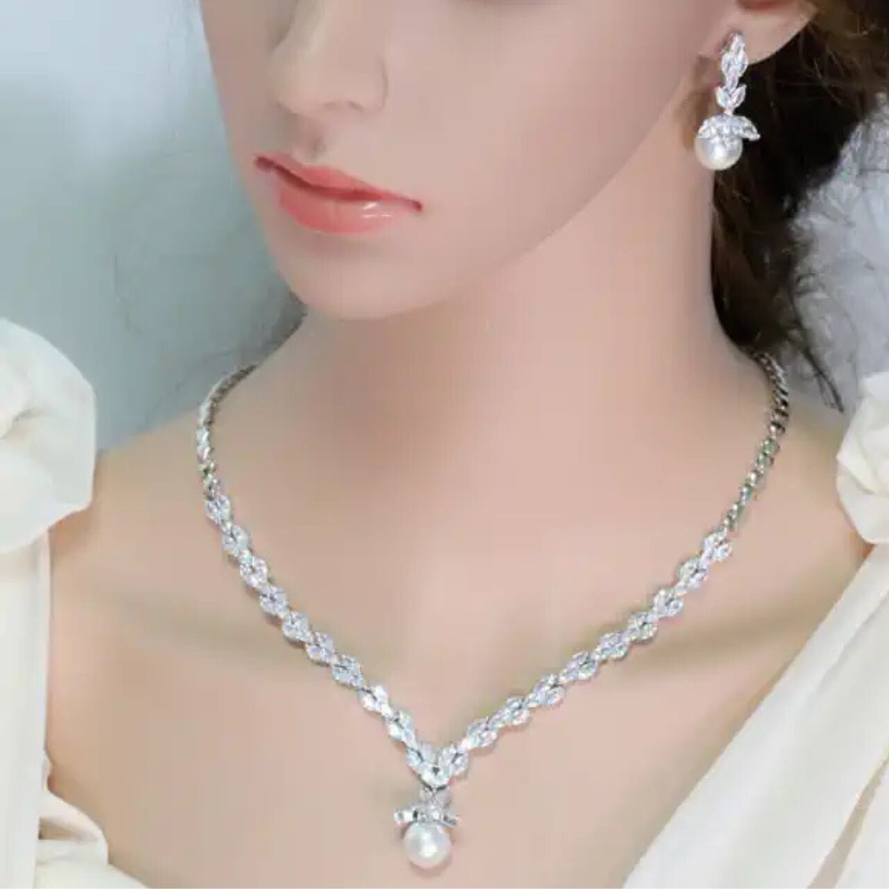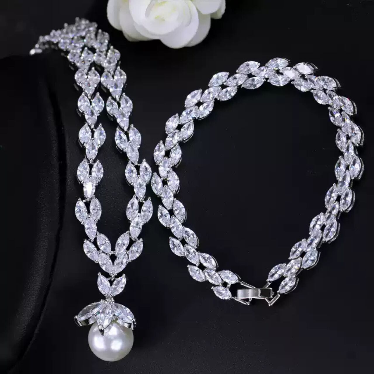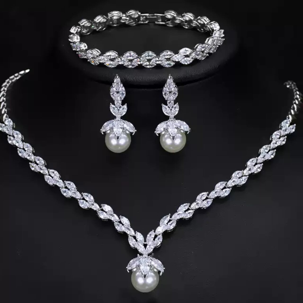 パールキュービックジルコニアネックレスピアスブレスレットセット CL0174