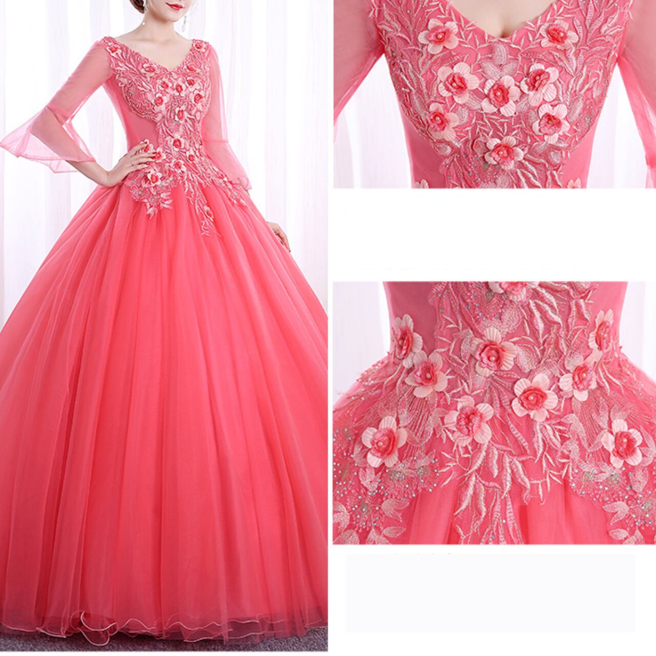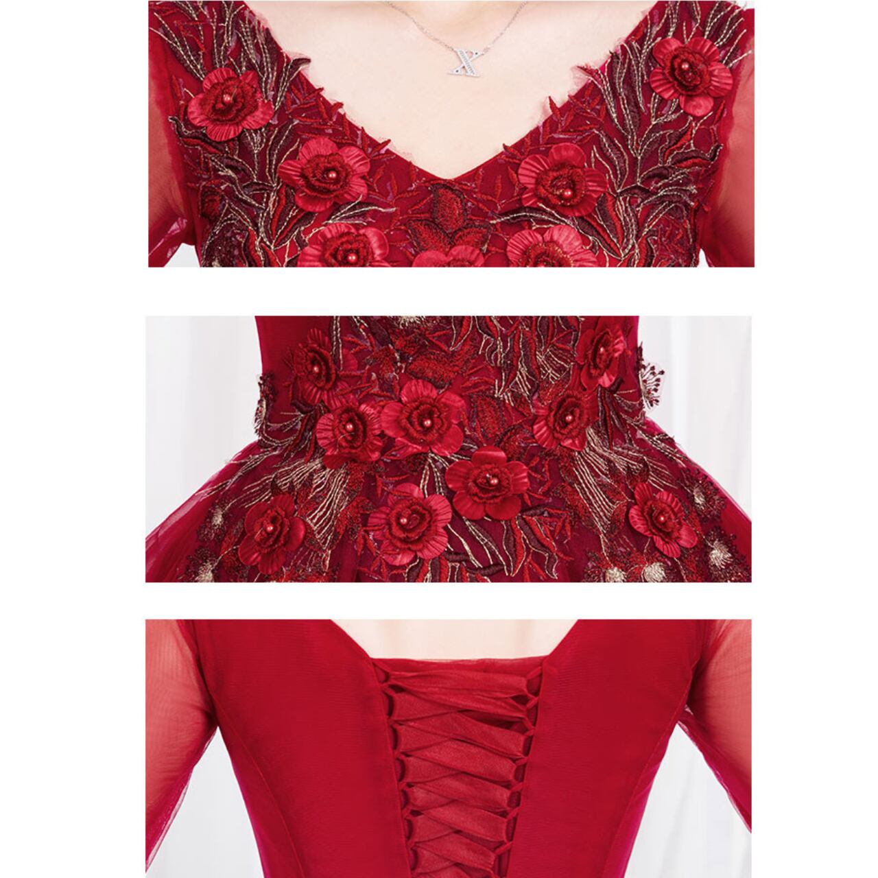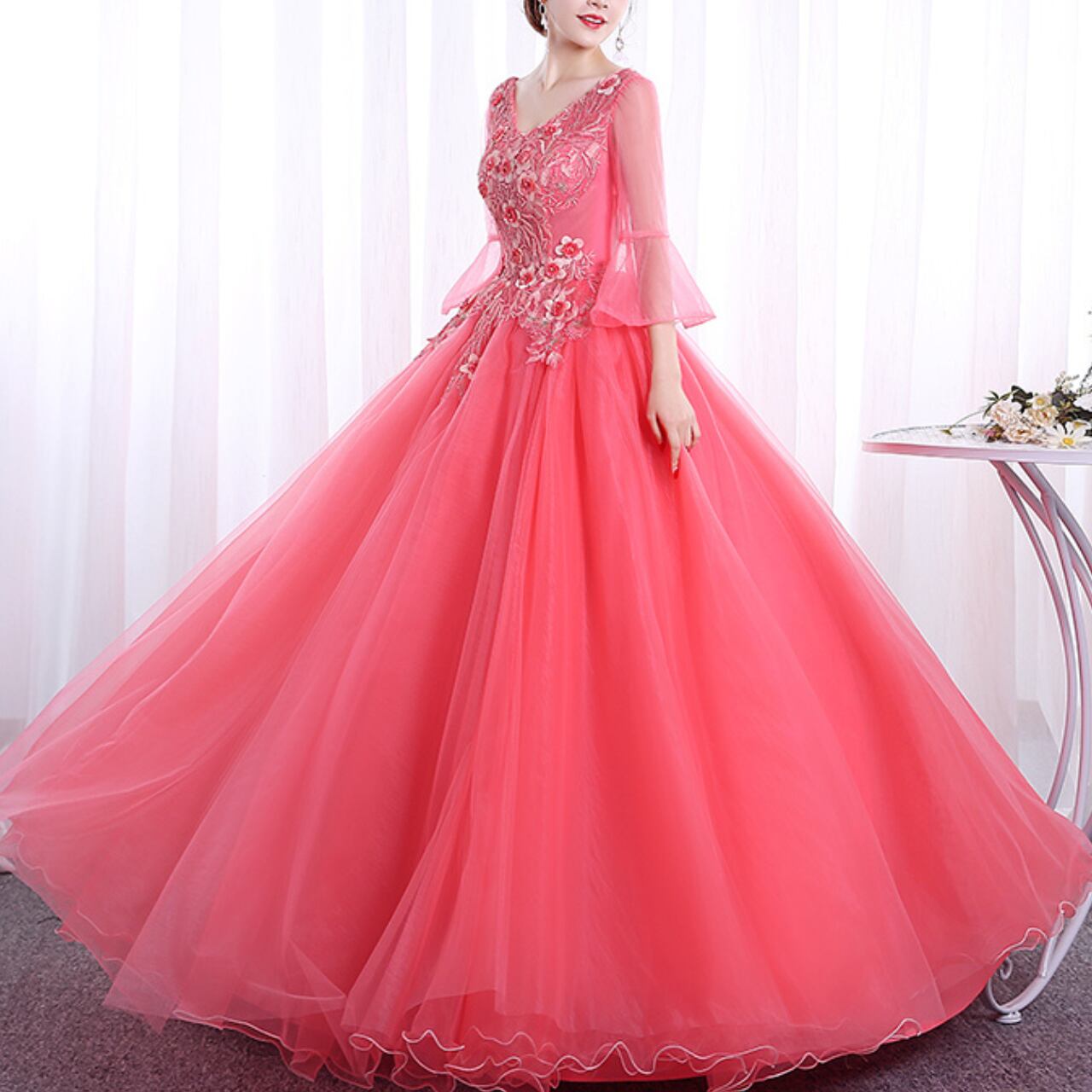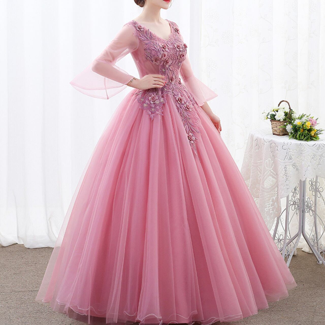エンブロイダリーベルスリーブ七分袖ドレス ピンク/レッド/他4color CL0177