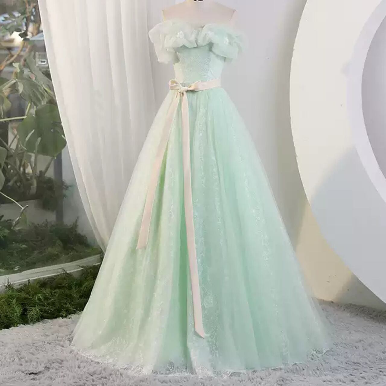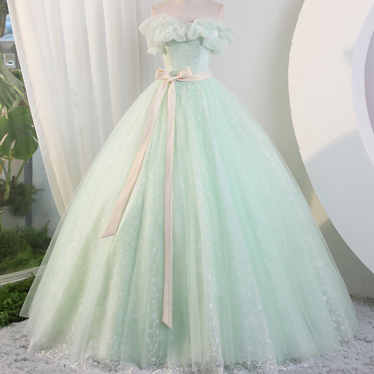 リボンベルト付きサテンチュールレースドレス CL0188